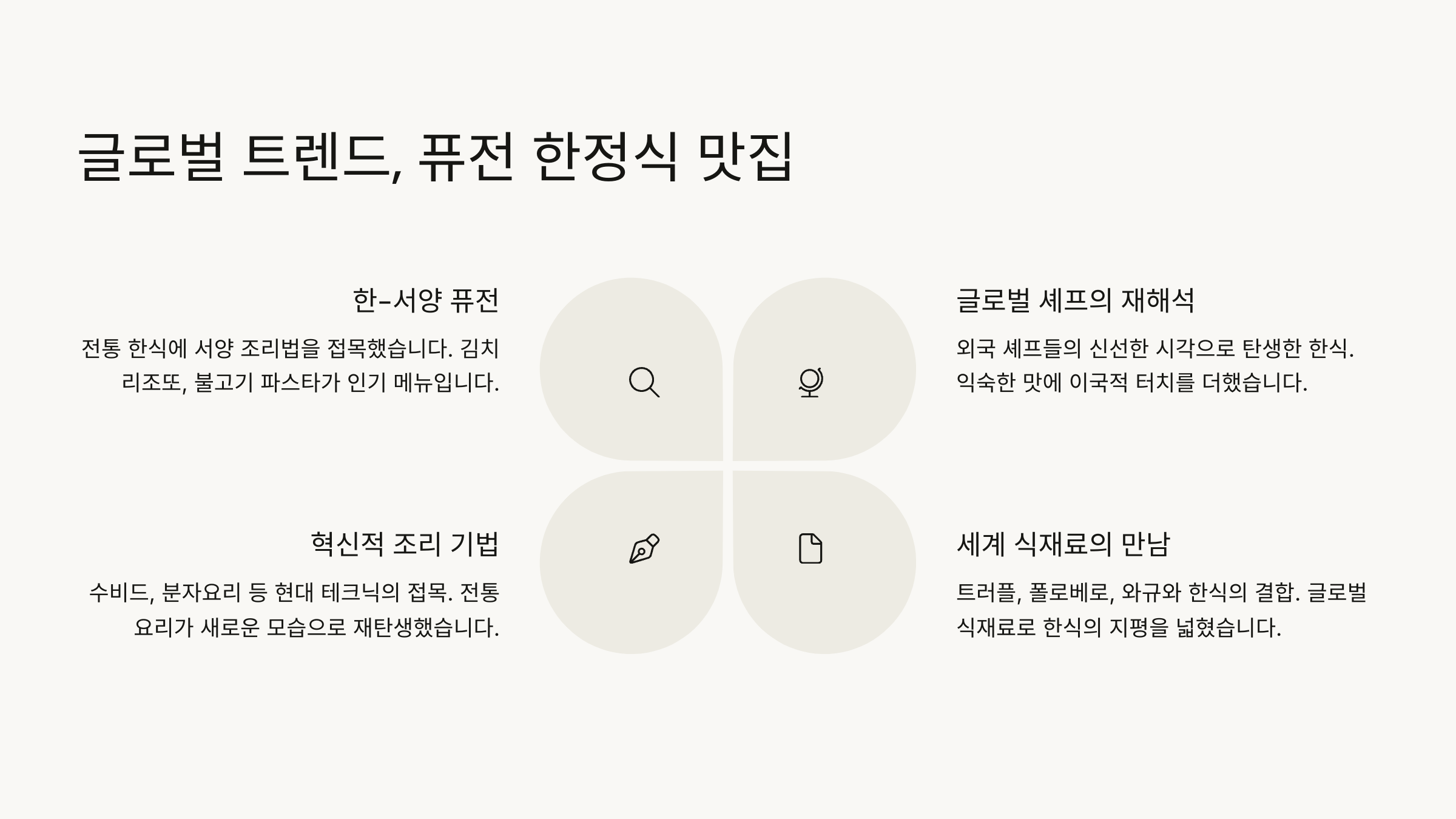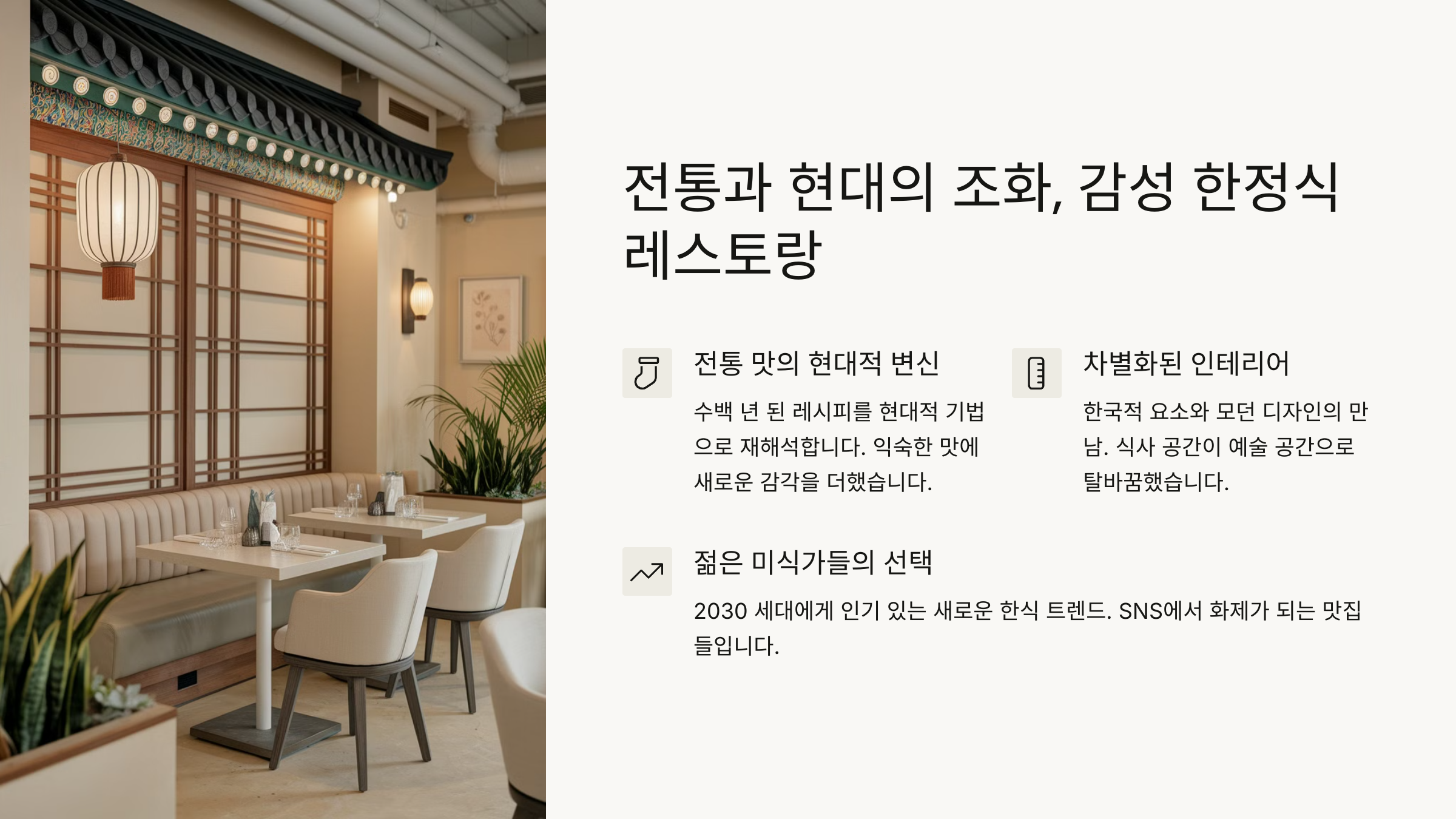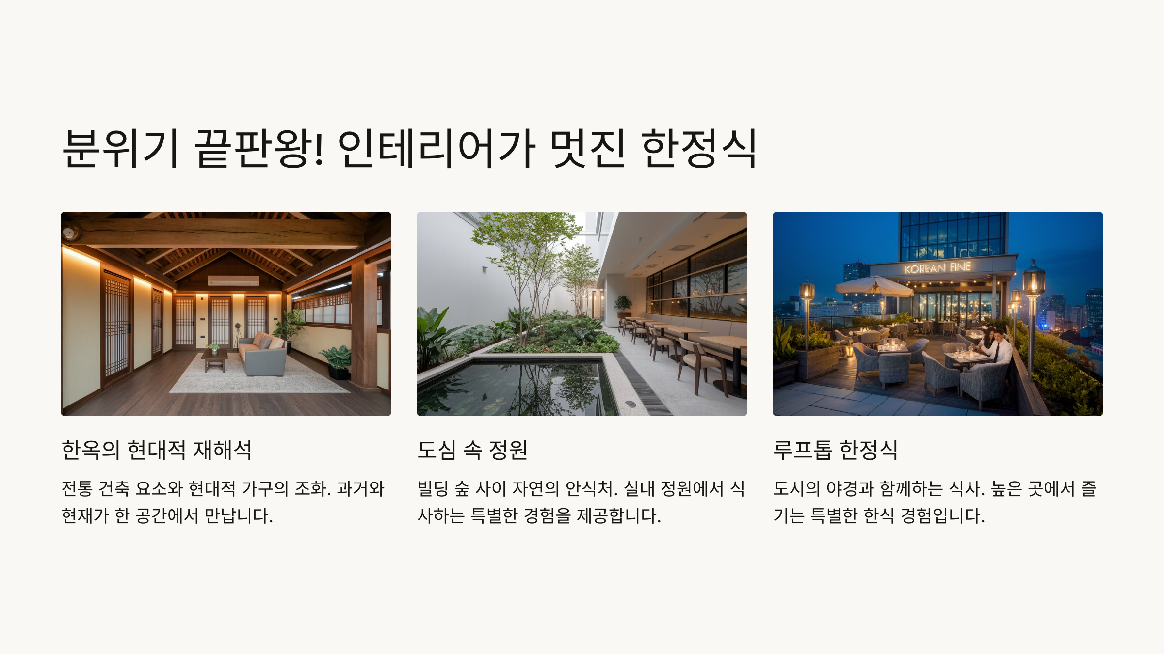 📌 아래에서 첫 번째 섹션인 ‘도심 속에서 즐기는 모던 한정식’부터 차례로 이어서 자동으로 보여드릴게요!