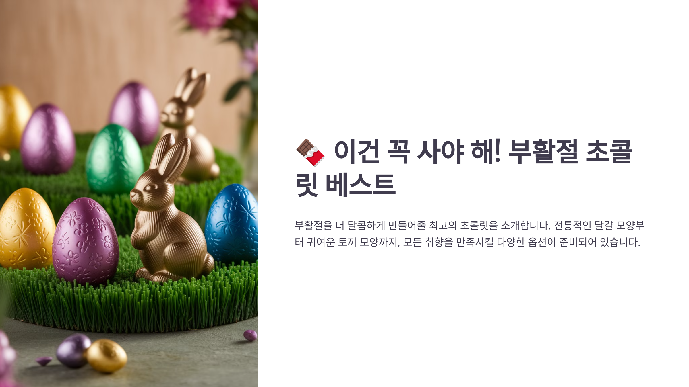 이처럼 부활절 초콜릿은 단순히 ‘먹는 것’을 넘어서, 시즌의 감성과 따뜻함을 전하는 존재예요. 어떤 종류를 고르든 받는 사람의 미소는 보장돼요 😊🍬