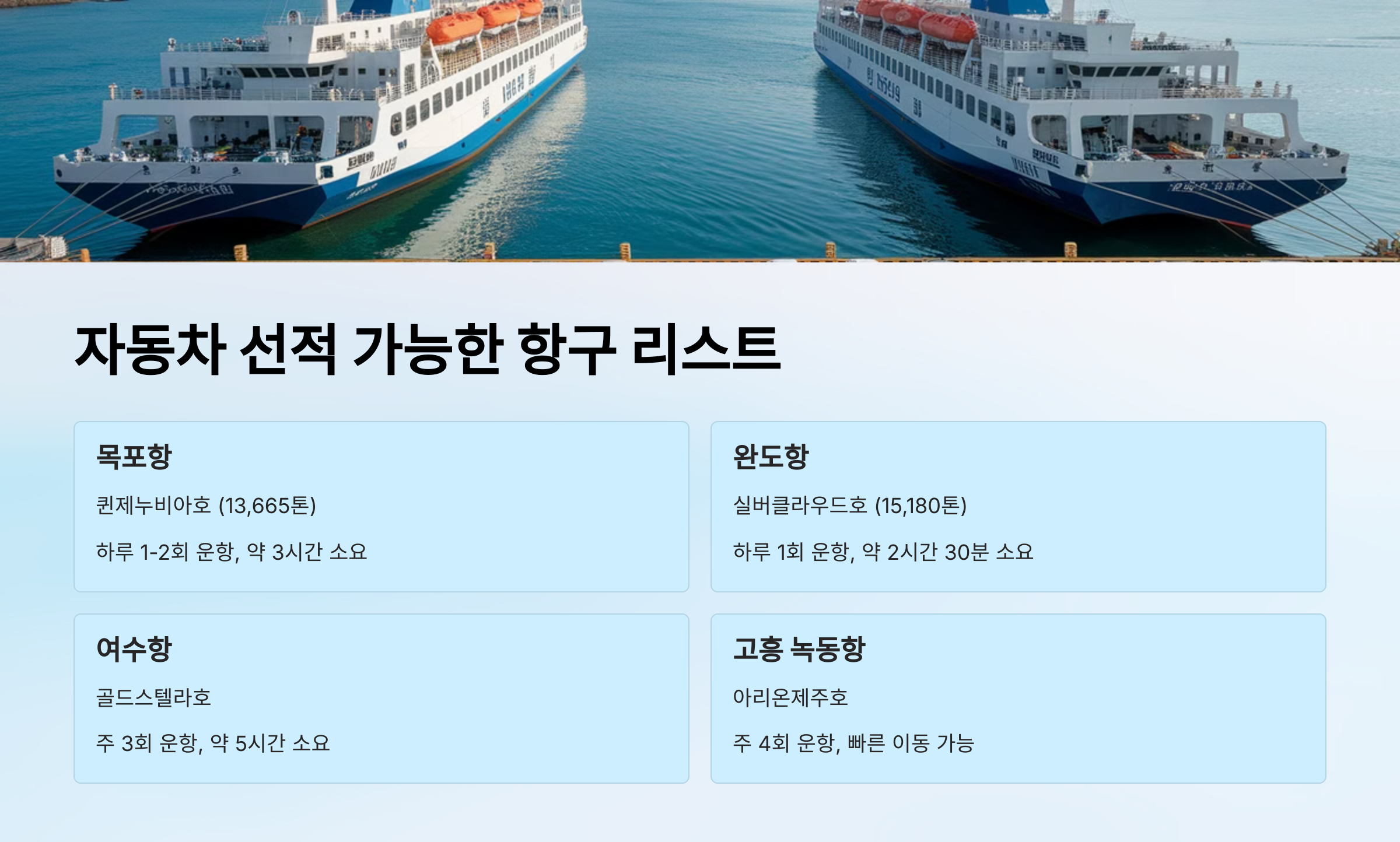 선택 가능한 항구가 많아서 여행 출발지에 따라 효율적인 노선을 잡을 수 있어요. 서울/경기권에선 목포, 광주나 전남에선 완도가 가장 빠르고 편해요. 경남/부산에서는 부산항이 야간 운항으로 시간 절약에 최고예요. 😎
