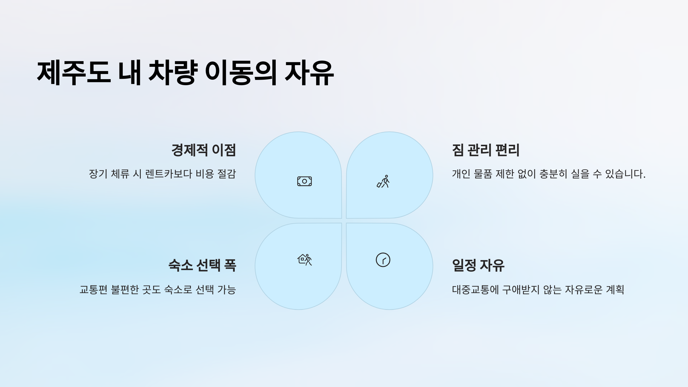 이처럼 자가용을 이용하면 제주에서의 여행은 진짜 자유로워져요. 누구 눈치 볼 필요 없이 내가 원하는 시간에, 내가 가고 싶은 곳으로! 💨