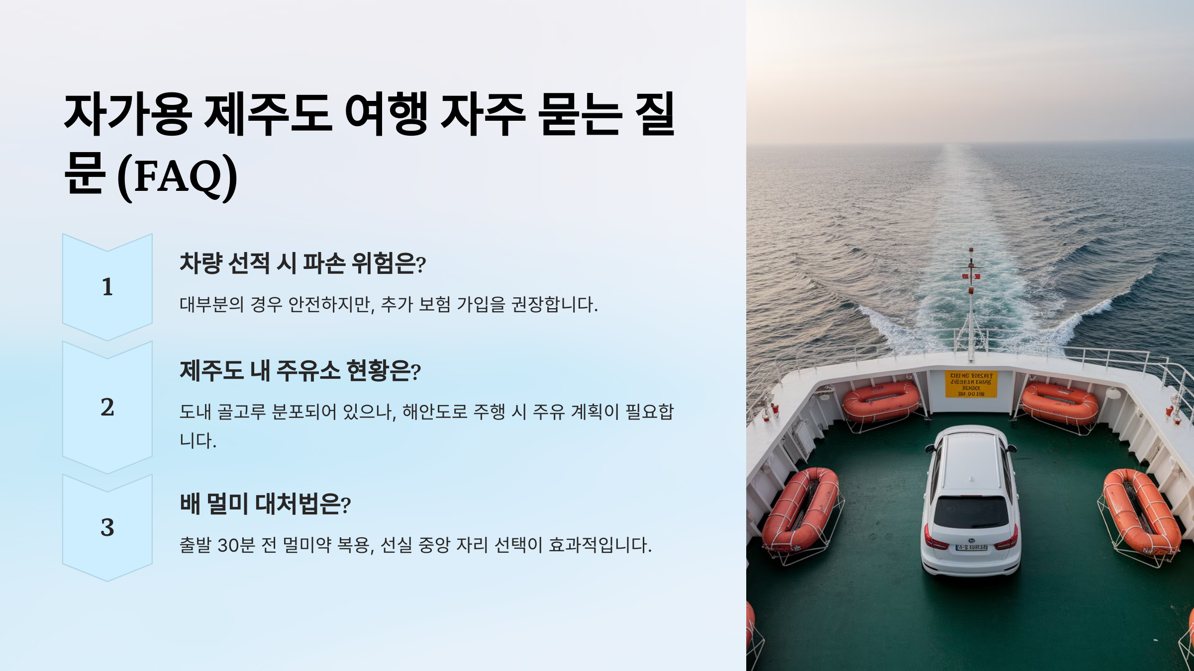 이제 마지막으로, 제주 자가용 여행 관련 자주 묻는 질문 (FAQ) 정리해드릴게요! 궁금했던 점들 한 번에 해결할 수 있어요! 🙋♀️