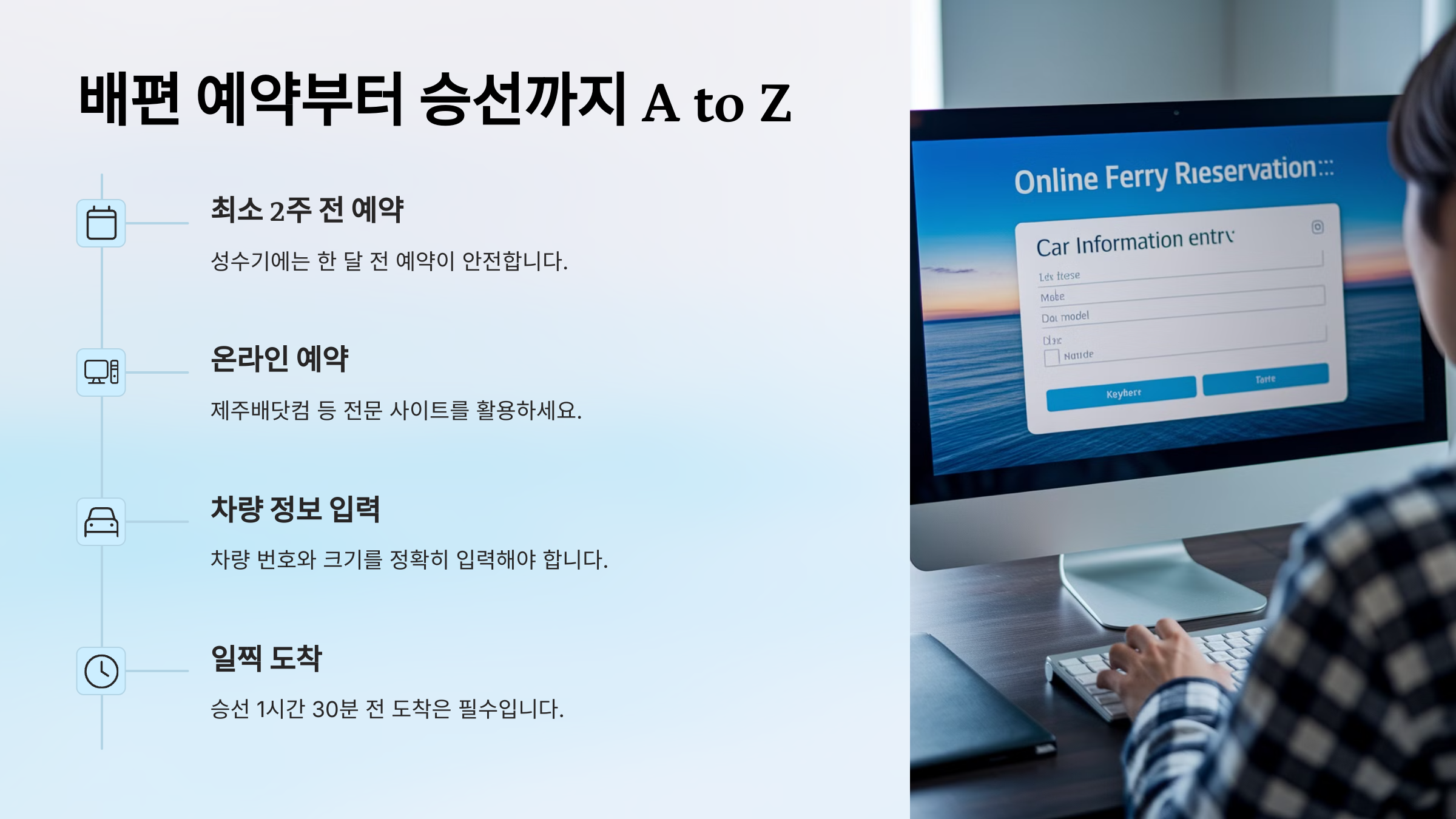 제주도로 자가용을 가져가려면 가장 먼저 해야 할 일은 배편 예약이에요. 대부분의 항구에서는 인터넷을 통해 선박 예약이 가능하고, 차량 동반 여부를 체크해서 진행할 수 있어요. 예매할 때 차량 번호, 차종, 차량 길이 등 차량 정보를 미리 입력해야 하니 미리 확인해두는 게 중요해요.