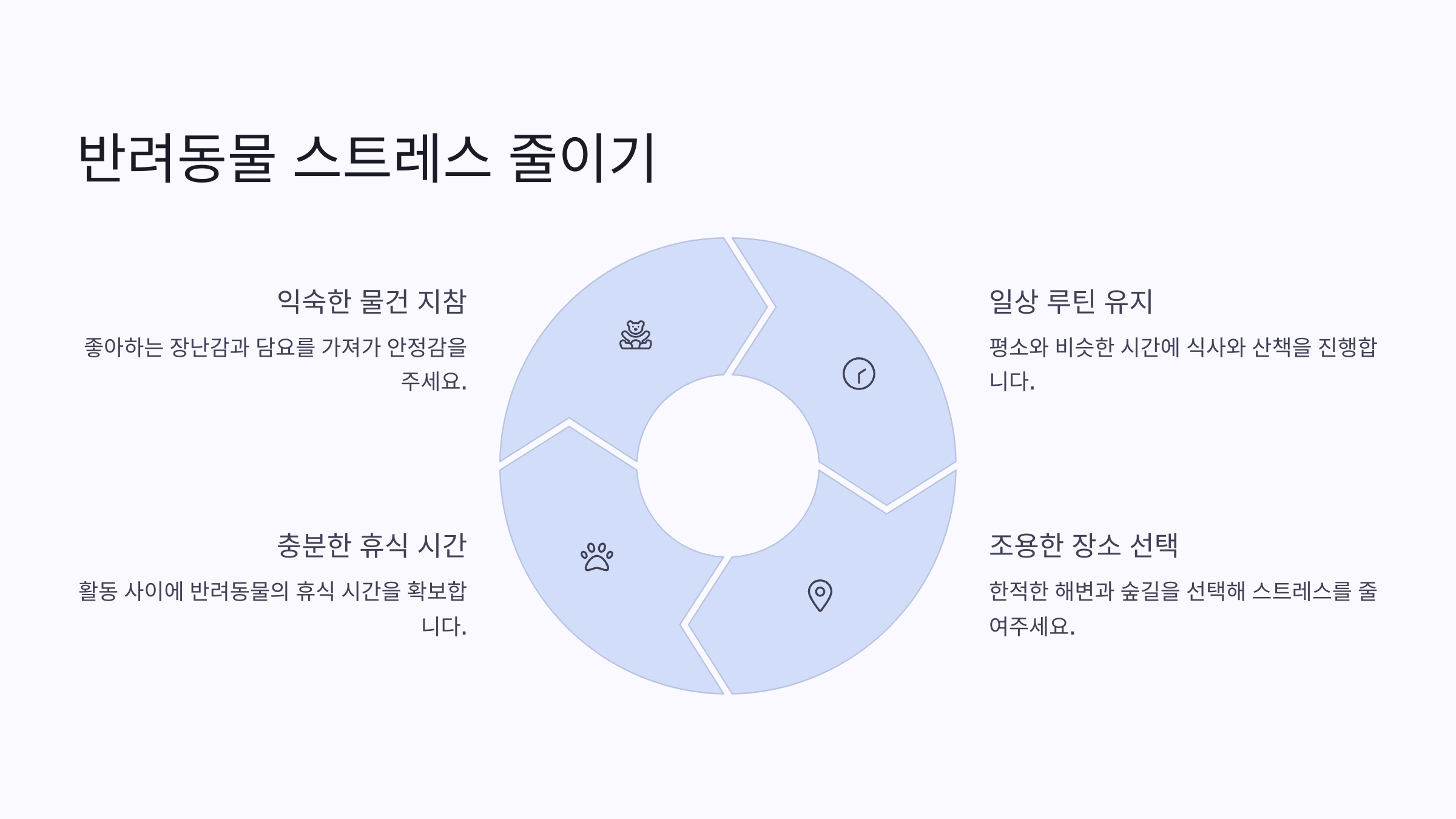 두 번째로 중요한 건 ‘일상 루틴 유지’예요. 밥 먹는 시간, 산책 시간, 잠자는 시간을 최대한 기존과 비슷하게 유지하면 반려동물이 안정감을 느껴요. 갑작스러운 식사 시간 변화나 무리한 일정은 피하고, 낮잠도 충분히 취할 수 있게 여유 있게 여행 계획을 세워야 해요.
