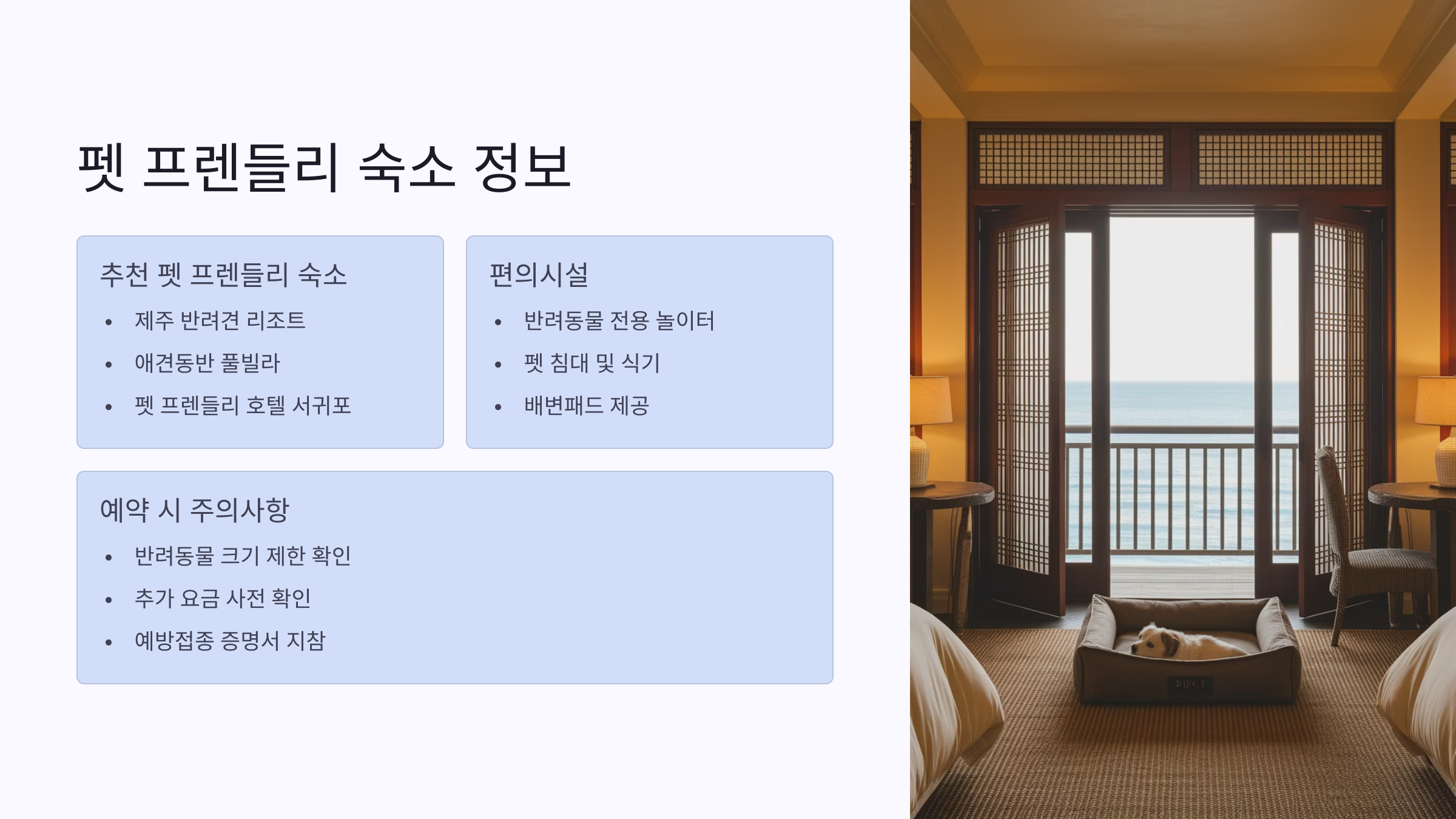 숙소에서 제공하는 편의 서비스도 중요해요. 전용 식기, 배변패드, 담요, 펫 샴푸 등을 제공해주는 곳이라면 훨씬 더 편하게 지낼 수 있어요. 어떤 곳은 반려동물 웰컴 기프트까지 주는 센스 넘치는 숙소도 있답니다. 이런 숙소는 후기가 좋아서 빨리 마감되니 미리 예약하는 게 좋아요!