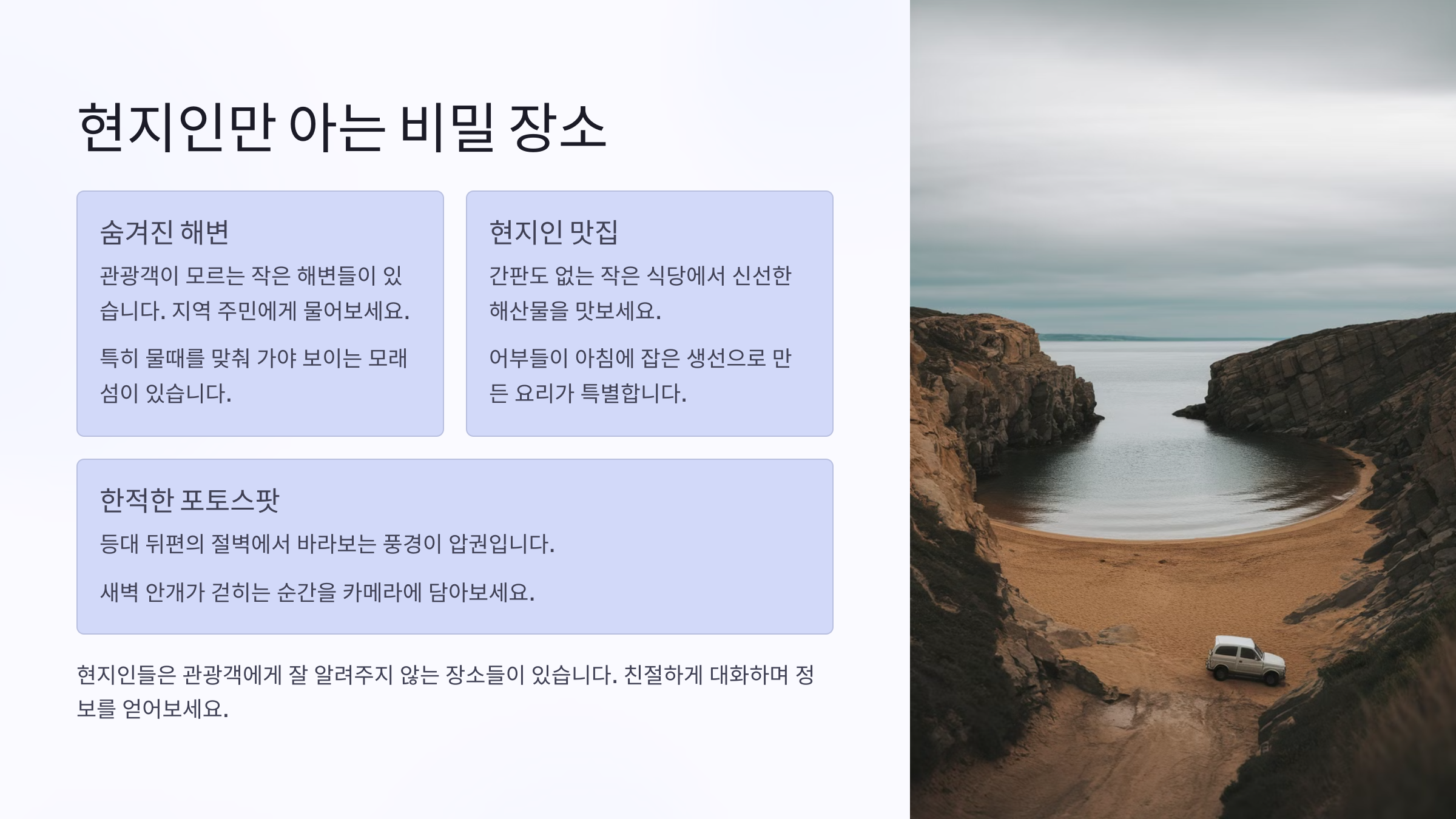 섬 여행의 진짜 묘미는 '지도에 없는 장소'를 발견하는 데 있어요. 관광객들이 몰리는 유명 스팟보다, 현지인들만 알고 있는 비밀 장소야말로 진짜 섬의 매력을 보여주는 공간이에요. 이런 장소는 보통 안내판도 없고, 자차 없이는 찾아가기도 어려운 곳이 많답니다.