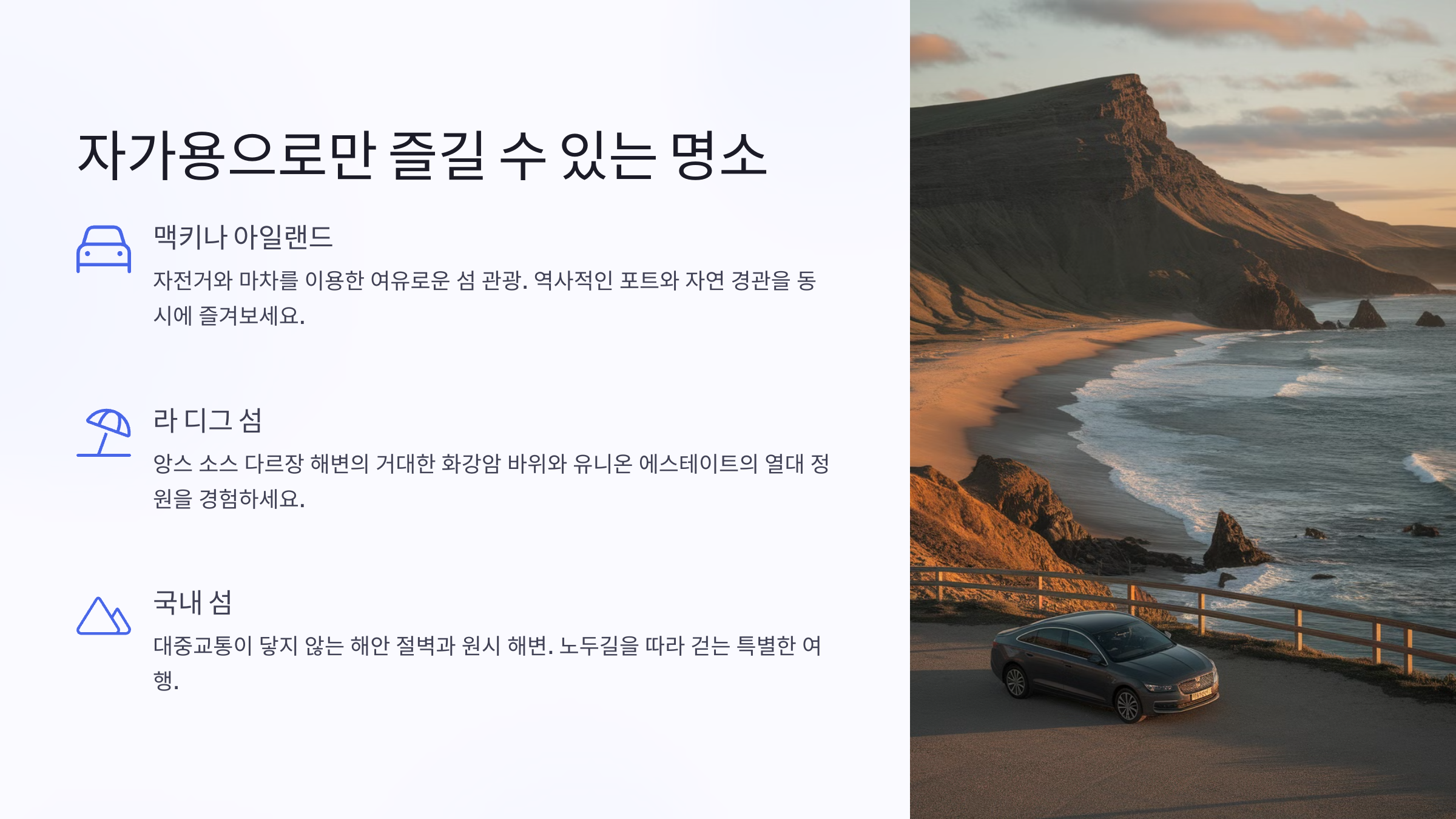 일부 섬에는 ‘차가 있어야만’ 갈 수 있는 숨겨진 스팟들이 있어요. 표지판 하나 없이 숨어 있는 해변이나, 산속에 숨겨진 전망대, 외지인에겐 알려지지 않은 갯바위 포인트 등은 자가용이 있어야 도달할 수 있답니다.
