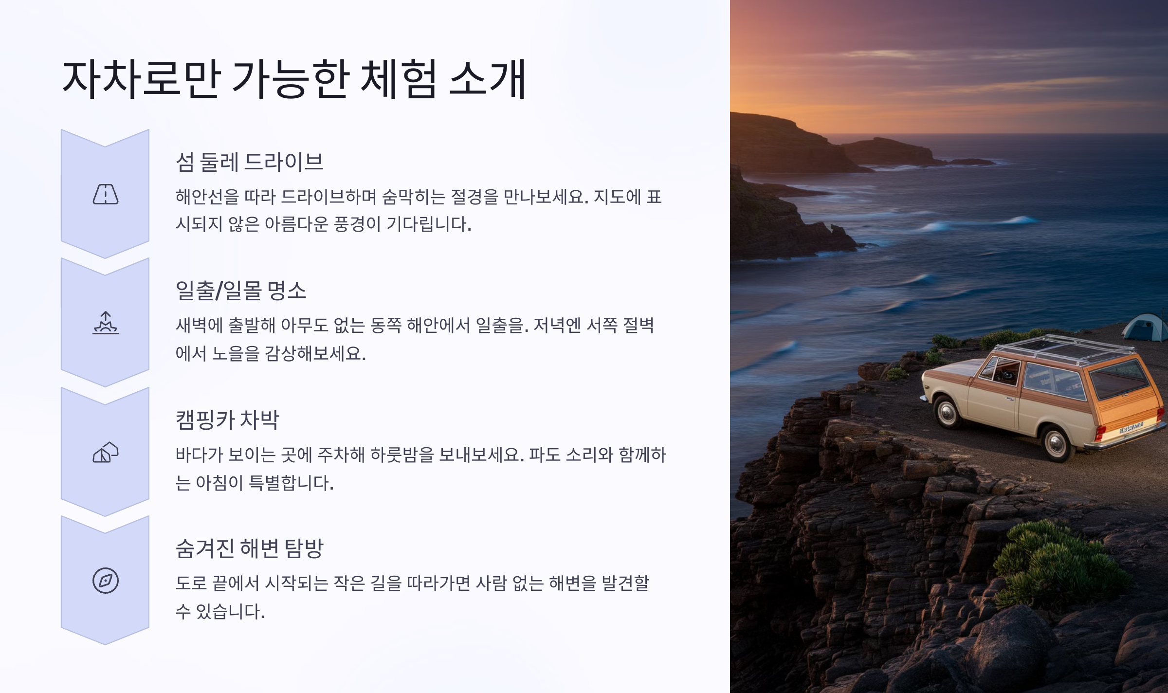 이 외에도 마을 주민들이 추천하는 해변 캠핑지나 일몰 명소는 지도에도 안 나오는 경우가 많고, 오직 자차로만 접근 가능한 곳이 많아요. 현지에서 얻은 정보로 차를 타고 그 길을 달리는 건 정말 색다른 재미예요.