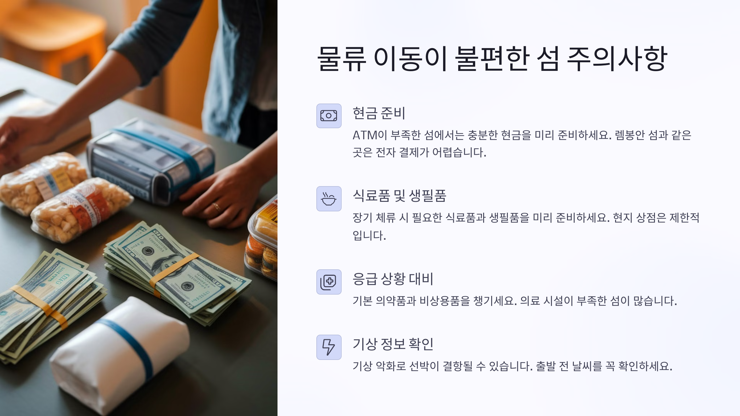 특히 캠핑족이나 장기 여행자라면 물류 상황을 반드시 체크해야 해요. 현지에서 구할 수 없는 물건은 미리 준비해서 가져가야 하고, 날씨에 따라 배가 결항되면 일정 전체가 흔들릴 수 있으니 유연한 일정 구성도 필요해요. 🛒
