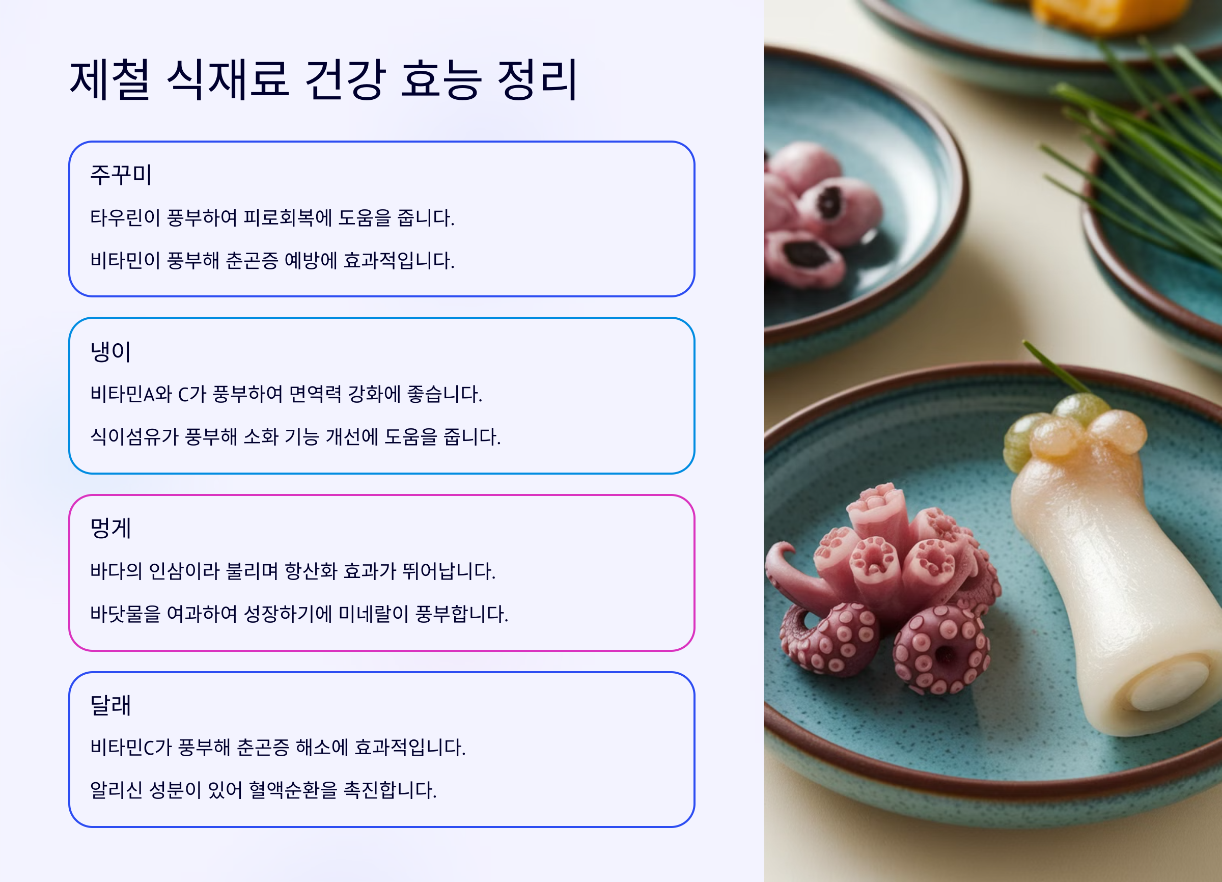 해산물도 빼놓을 수 없어요. 주꾸미는 DHA가 풍부해 뇌 건강에 좋고, 미더덕은 칼륨과 단백질이 많아 체내 염분 배출을 도와줘요. 멍게는 아연과 요오드 성분이 풍부해 갑상선 건강과 신진대사를 활발하게 만들어준답니다.
