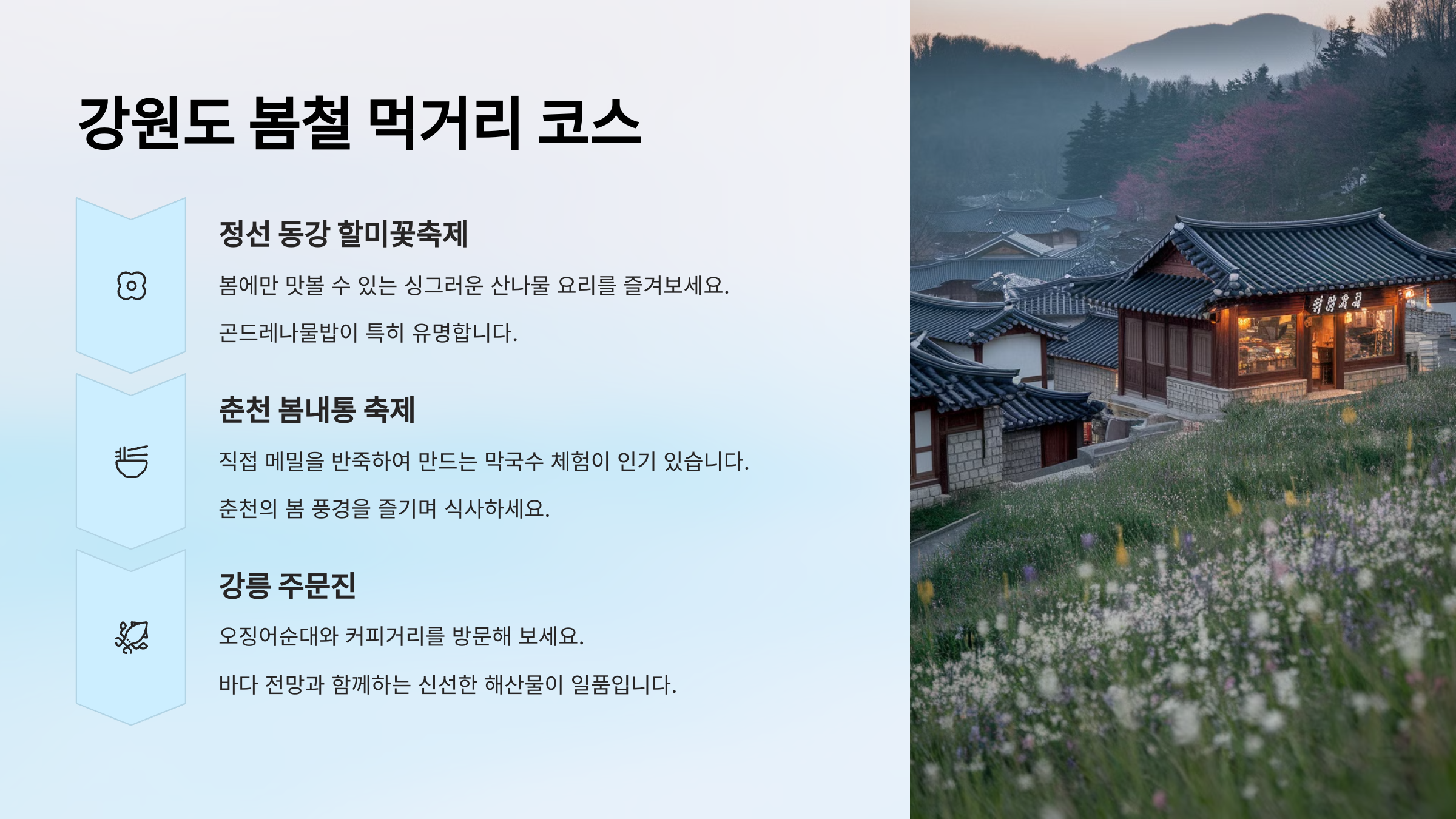 강원도의 봄 미식여행은 자연에서 온 식재료와 전통이 어우러져 더욱 특별해요. 간단한 듯하지만 깊은 맛을 지닌 음식들이 많아서, 속을 편안하게 해주고 건강도 챙길 수 있답니다. 봄 기운 가득한 강원도로 식도락 여행 떠나보세요! 🌿