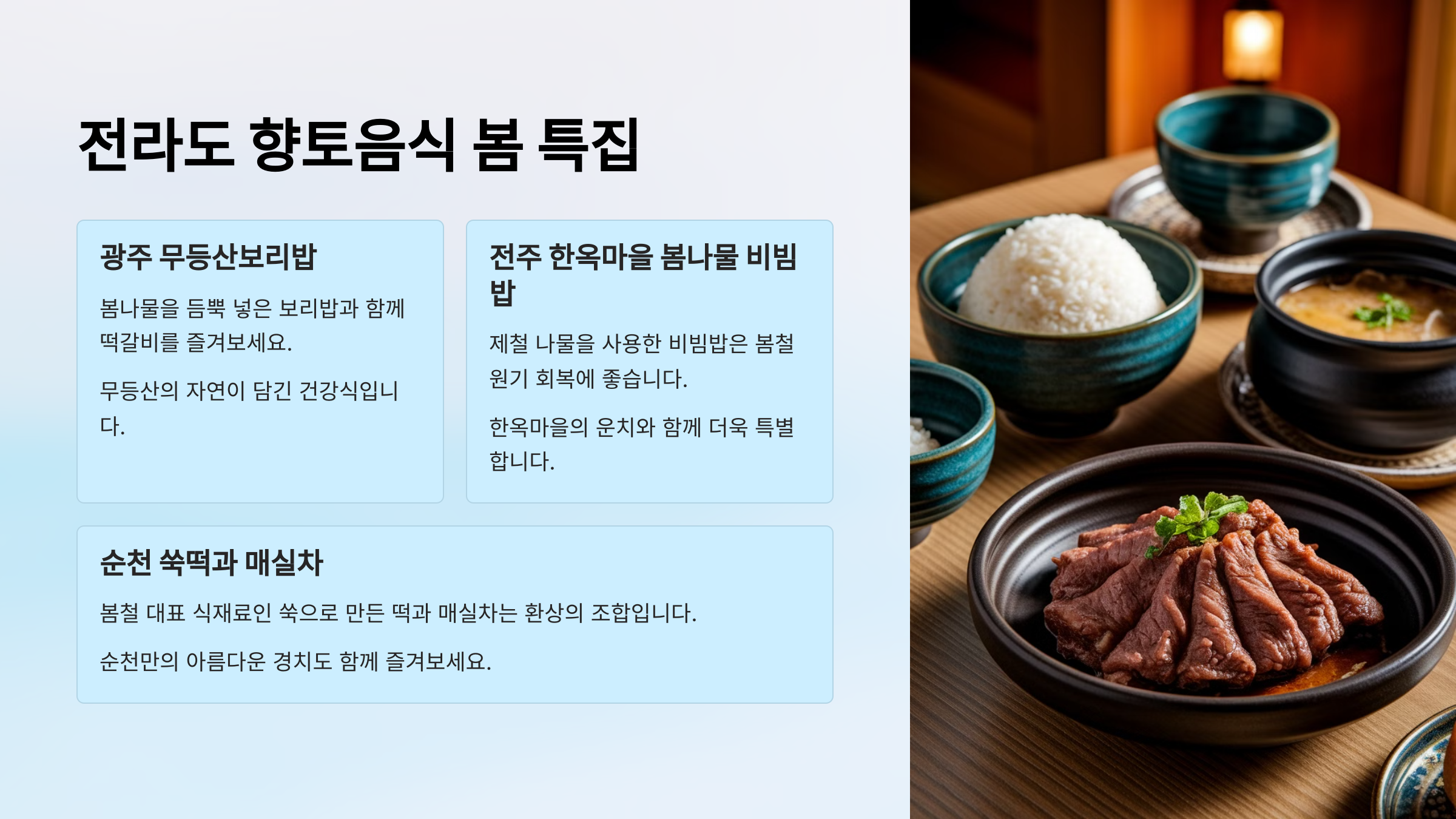 전라도는 ‘맛의 고장’이라 불릴 만큼 진하고 깊은 맛의 음식들이 많아요. 봄이 되면 그 풍성한 맛에 제철 식재료가 더해져 미식의 절정을 보여주는 지역이죠. 특히 전주, 순천, 여수, 광주 등 각 지역마다 고유한 향토음식이 계절을 입고 새롭게 변해요.