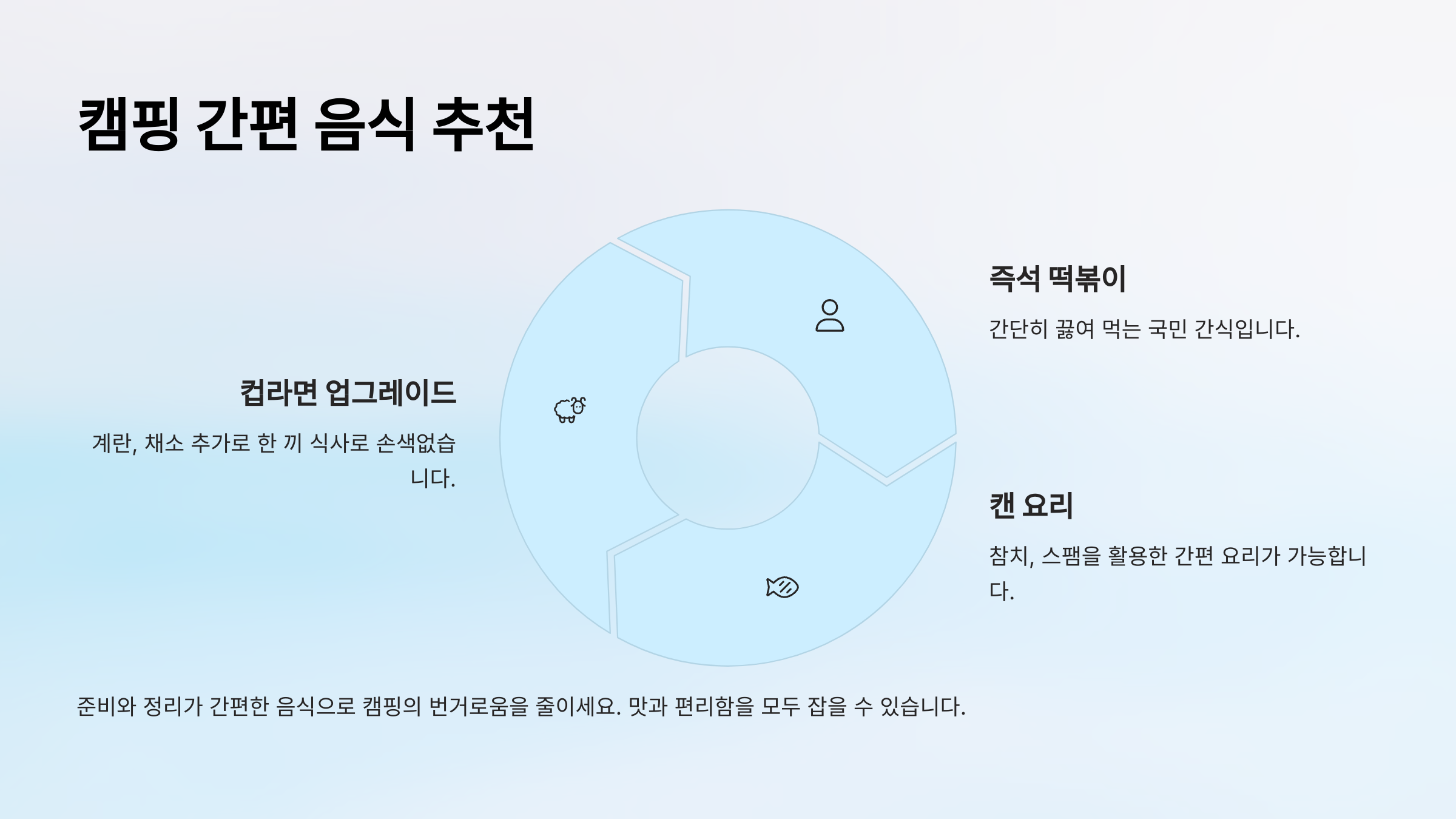 다음 섹션에서는 바쁜 아침이나 간단한 점심에 딱 맞는 초간편 캠핑 요리를 소개할게요! 🍳 조리도구 최소화! 편하고 맛있는 레시피들이 기다리고 있어요.