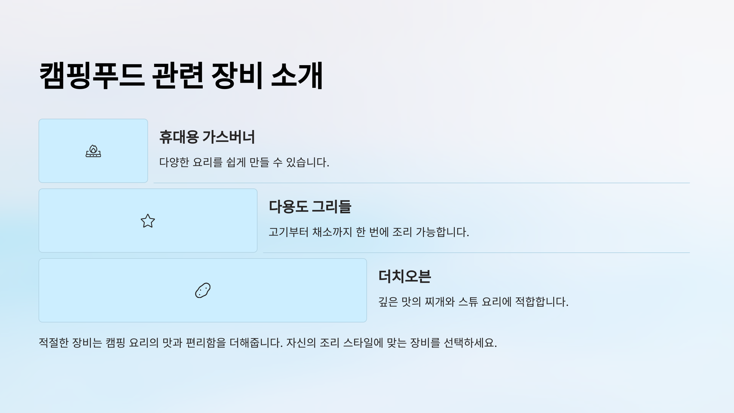 이제 마지막으로 캠핑푸드를 더 맛있게 만들어주는 캠핑 전용 조리 장비들을 소개할게요! 요리도 장비빨이라는 말, 괜히 있는 거 아니에요. 🍳