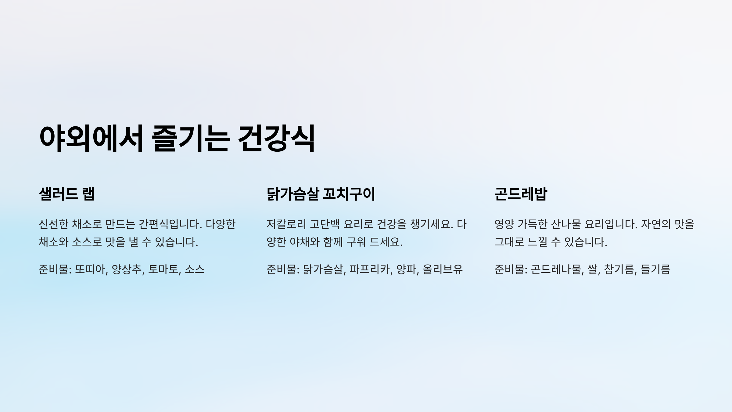 ▼ 다음은 [야외에서 즐기는 건강식] 섹션입니다!