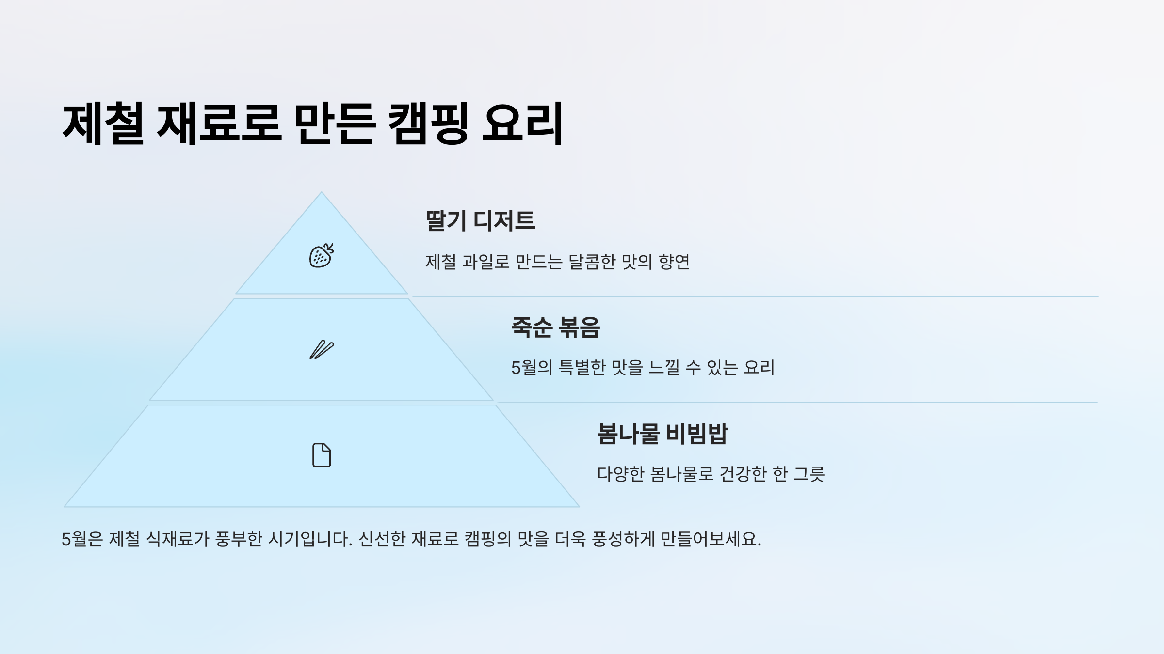 제가 생각했을 때, 5월 캠핑에는 제철 식재료를 적극 활용하는 게 자연과 더 가까워지는 기분이 들고, 요리도 훨씬 풍성해져서 꼭 추천하고 싶어요. 단순한 구이 요리에서 벗어나, 봄의 색을 담은 식탁을 차려보세요!
