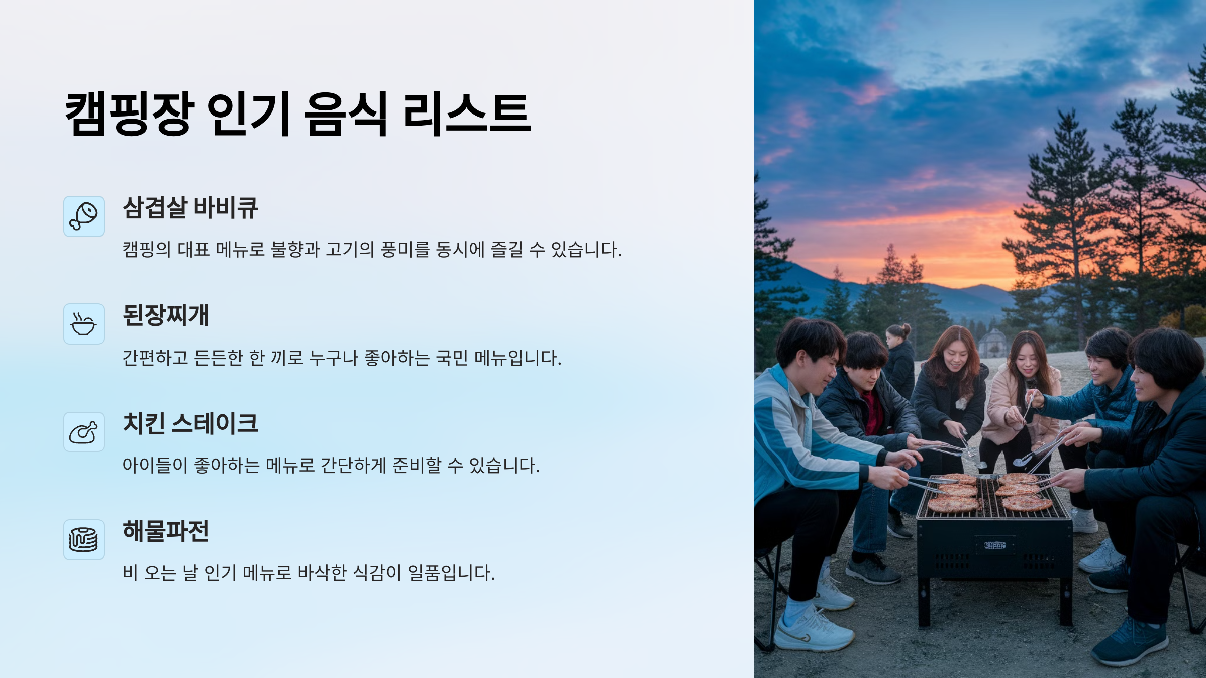 이 음식들은 캠핑장 분위기를 확 살려줄 뿐 아니라, 조리도 어렵지 않아서 누구나 도전할 수 있어요. 아이들 간식부터 어른들 안주까지 다양하게 즐길 수 있죠. 단체 캠핑이나 가족 여행 시에도 실패 없는 메뉴들이에요!