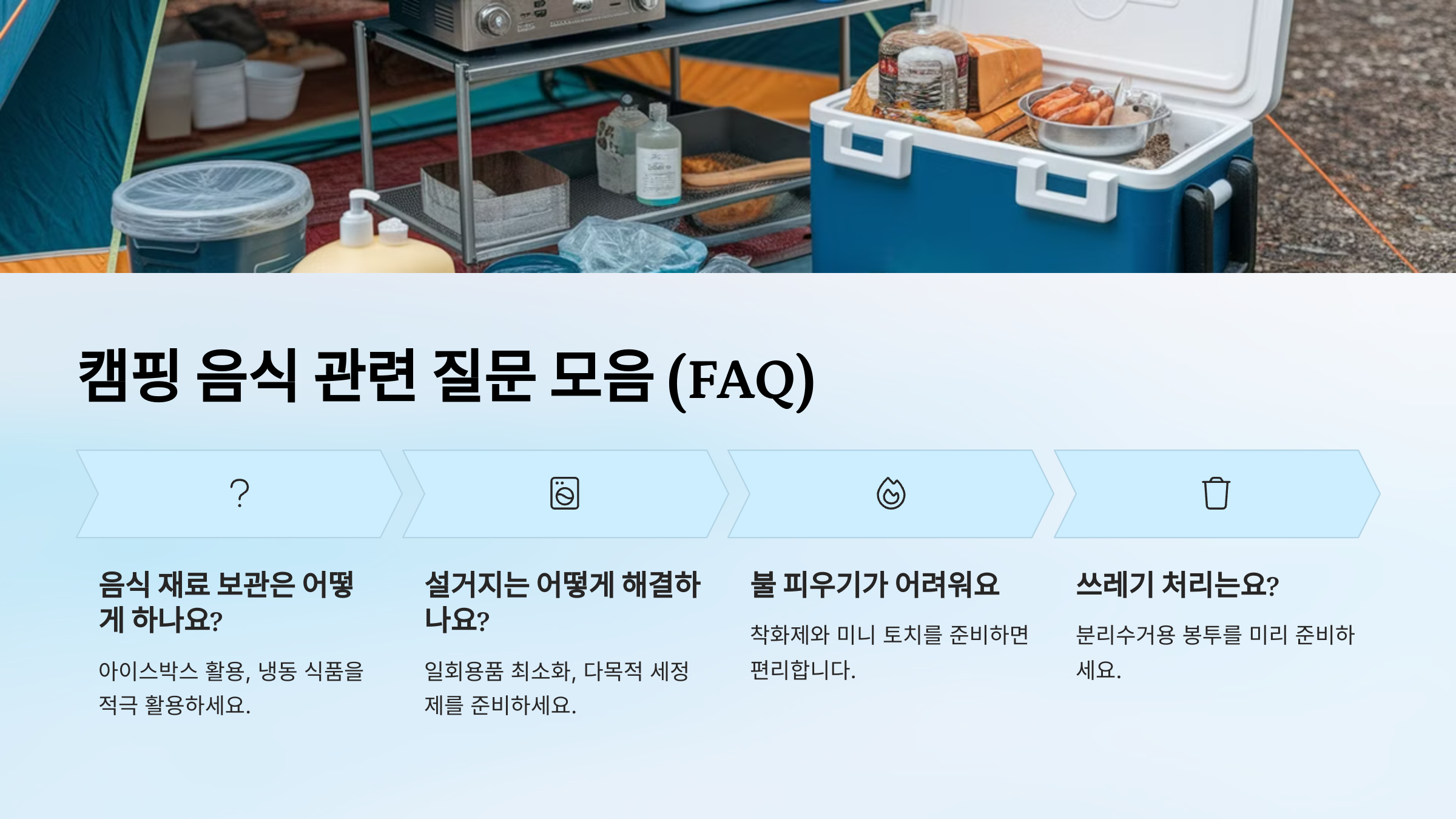 이제 마지막으로 캠핑 요리와 관련된 가장 자주 묻는 질문 8가지를 모아 FAQ로 정리해볼게요. 다들 궁금했던 내용들, 여기서 한 번에 확인하세요!👇