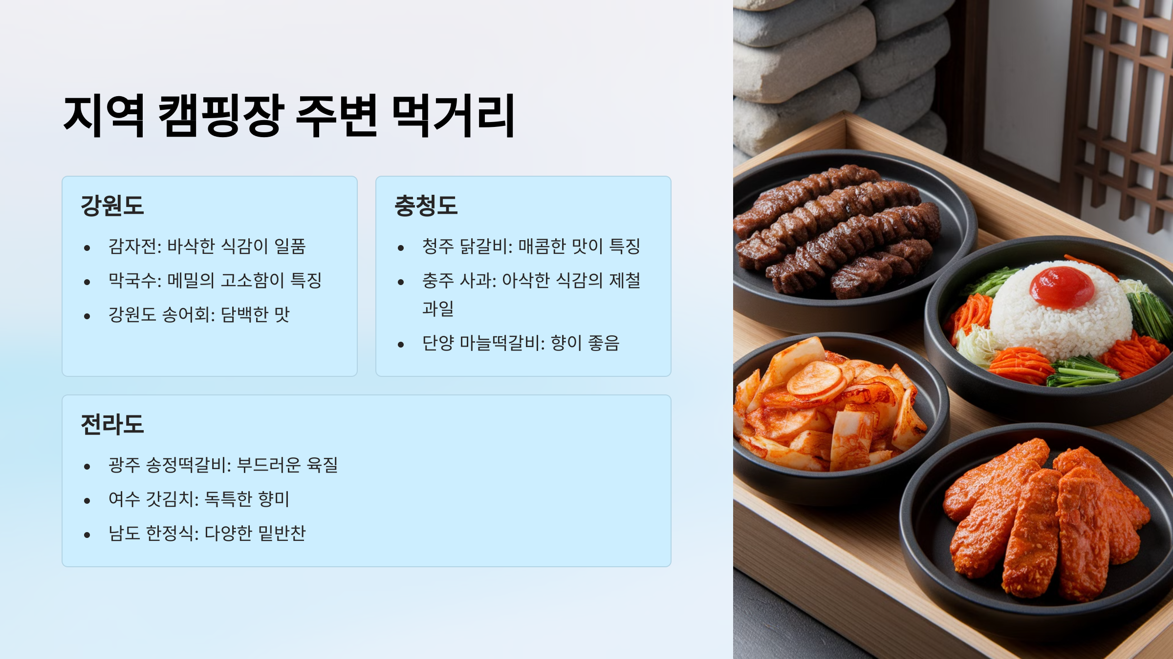 이제 다음 섹션에서는 캠핑장 근처에서 맛볼 수 있는 지역별 먹거리들을 소개할게요! 현지에서 먹는 음식의 감동은 또 다르잖아요? 😋