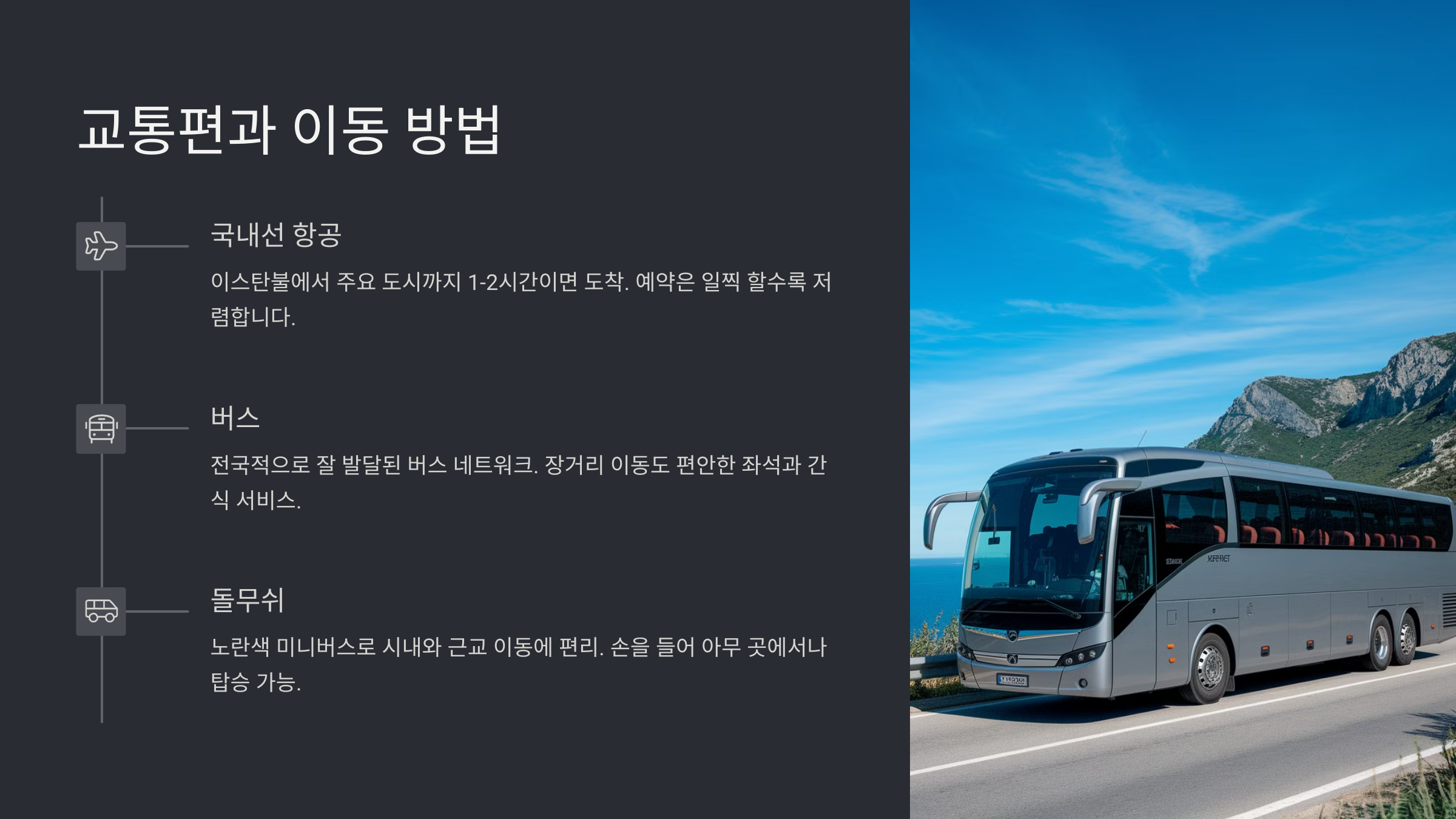 | 고속버스 | 중거리 | 넓은 좌석, 다양한 노선 | 장시간 이동 | 앙카라-카파도키아 |