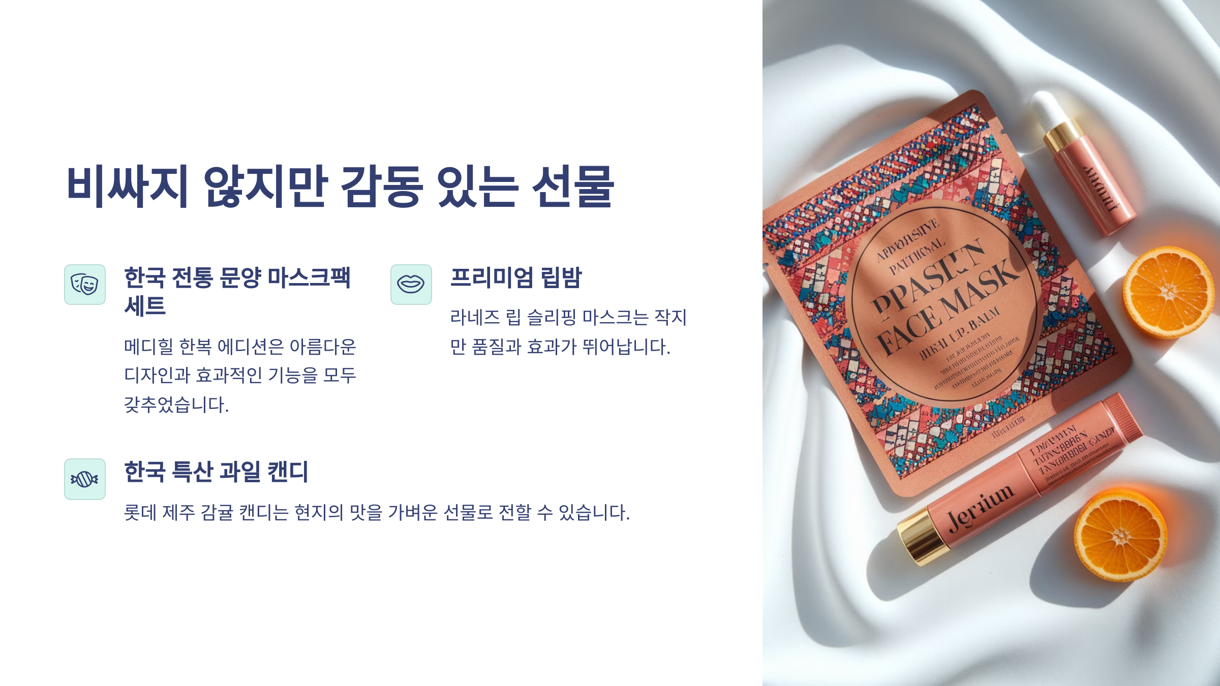 여행지의 정체성을 그대로 담은 ‘지역 특산물 기반 면세템’은 전통적인 기념품을 색다르게 재해석한 선물이에요. 현지에서 나는 재료를 활용한 아이템은 특별함은 물론, 유일무이한 감성을 선사하죠. 🧡