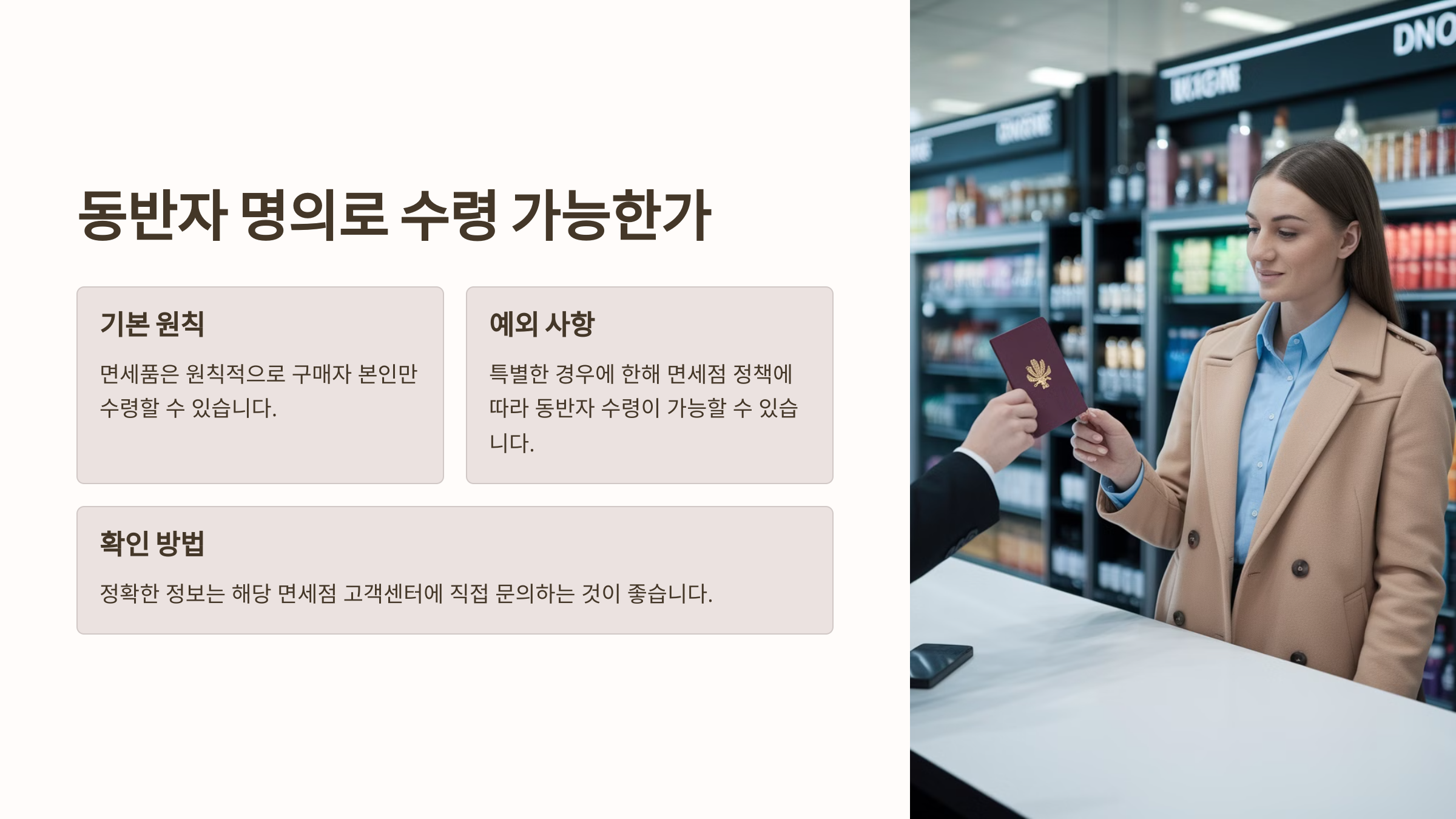 다만 일부 면세점에서는 예외적으로, 동일 항공편을 이용하는 가족이나 배우자에 한해 수령을 허용하는 경우도 있어요. 이 경우엔 ‘동반자 수령 동의서’나 추가 확인 절차가 필요하니 사전에 꼭 고객센터에 문의해야 해요. 📞