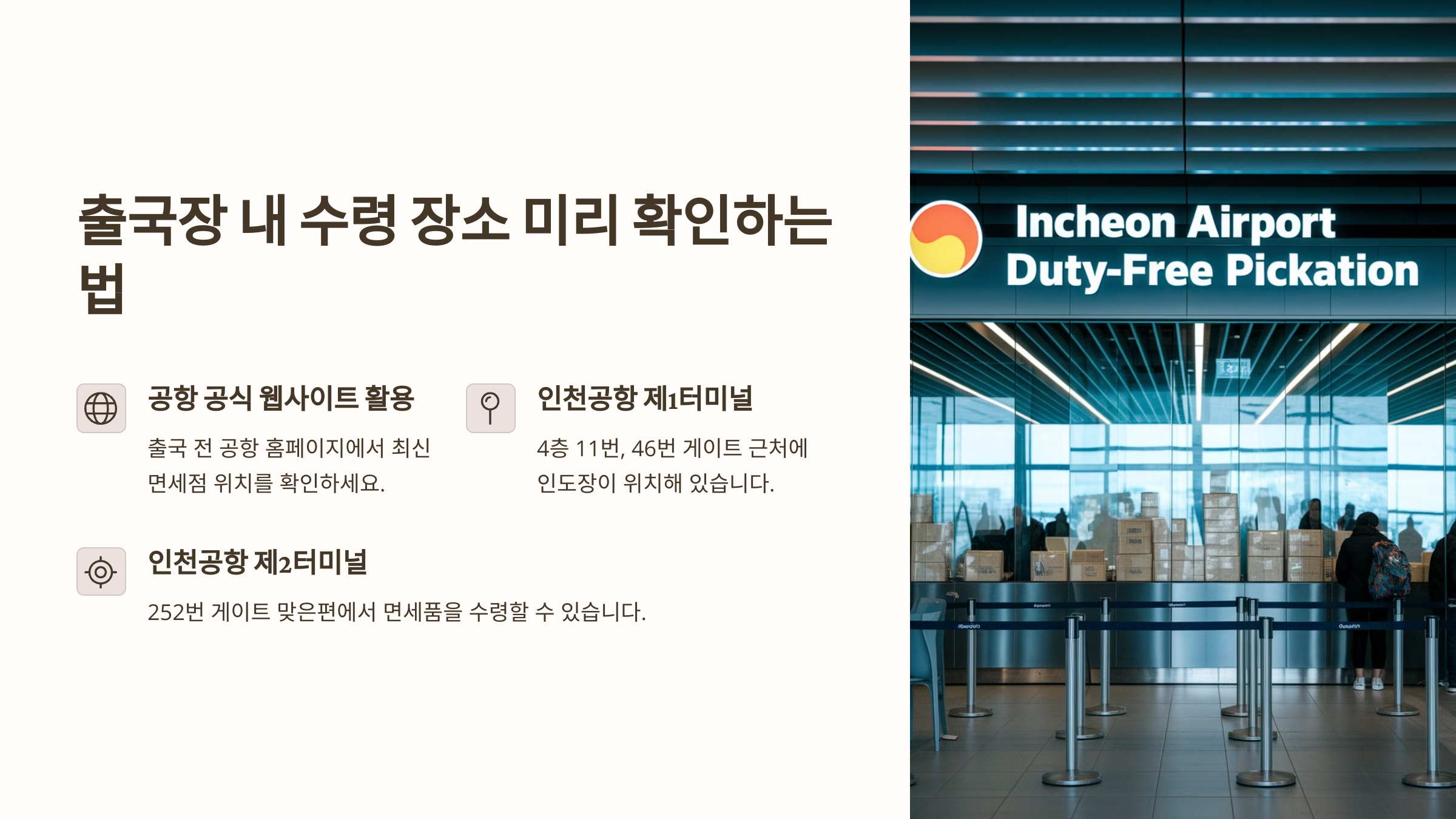 예를 들어 인천공항은 제1터미널, 제2터미널, 탑승동(D동)으로 나뉘고 각기 다른 위치에 면세품 수령장이 있어요. 본인이 출발하는 항공편 터미널과 수령장이 일치하지 않으면 문제가 될 수 있으니 꼭 확인해야 해요.