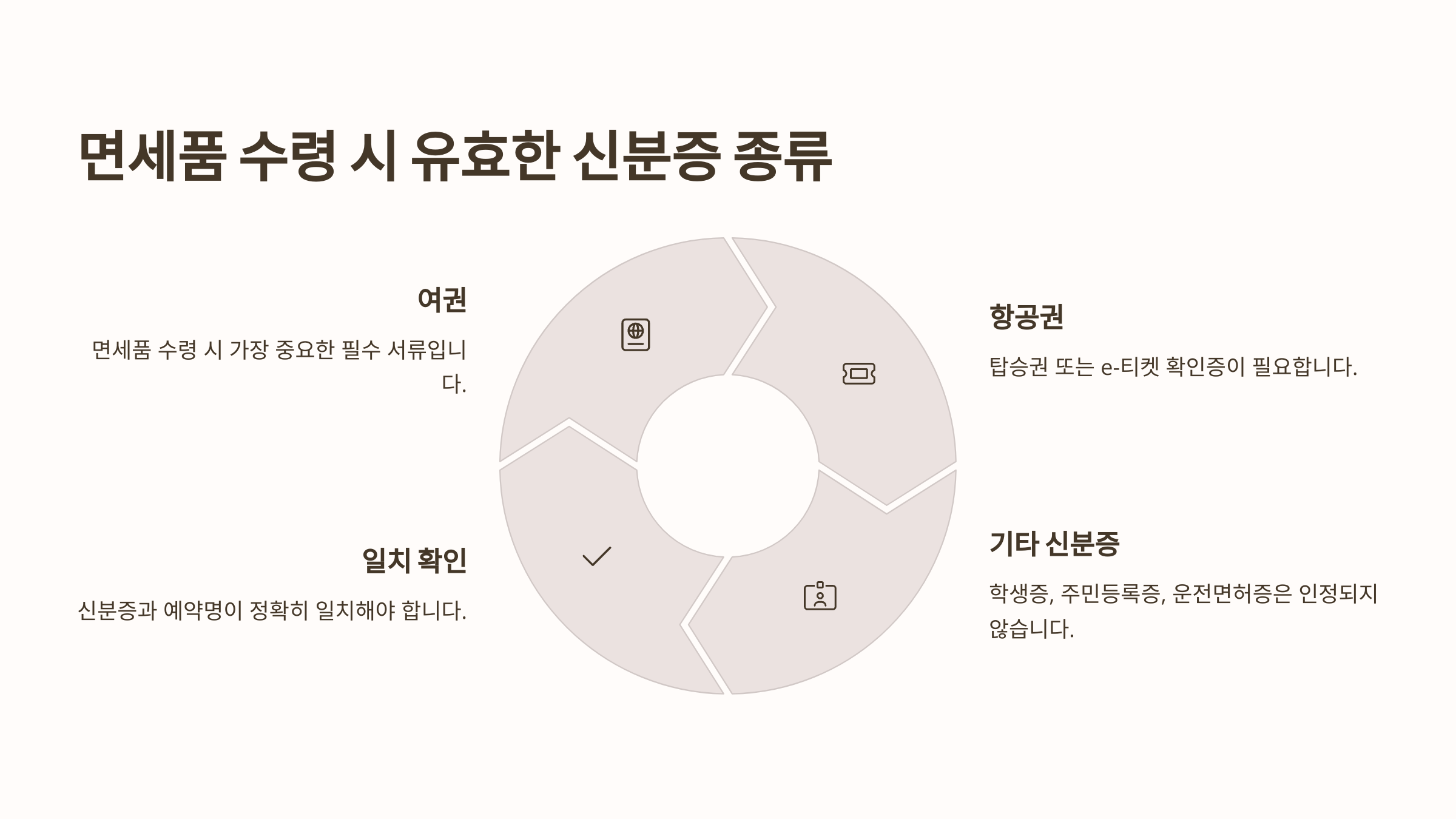 면세품을 수령할 때 반드시 필요한 것이 바로 ‘신분증’이에요. 하지만 아무 신분증이나 되는 건 아니고, 유효한 '본인 확인이 가능한 공식 서류'만 인정돼요. 잘못된 신분증을 가져가면 수령 자체가 불가능할 수 있답니다. 😱