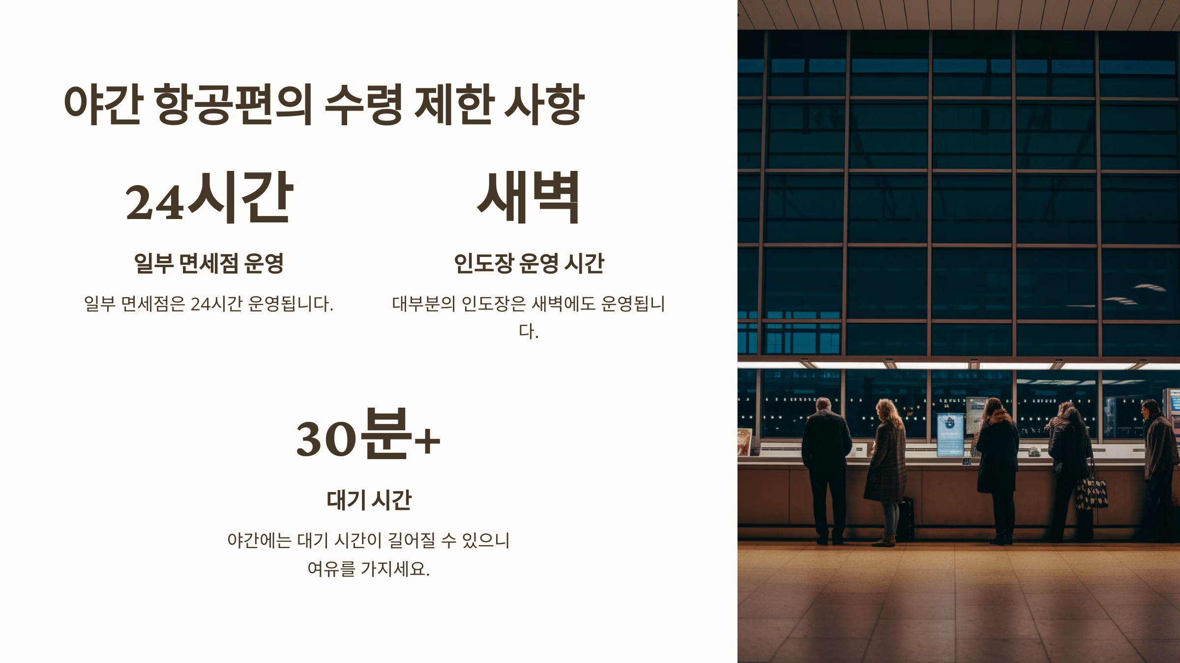또한 수령장이 운영 중이더라도, 야간에는 대기 인원이 많거나 인력이 줄어들어 처리 속도가 늦어질 수 있어요. 따라서 최소 출국 2시간 전에는 공항에 도착하는 것이 좋아요. ⏰