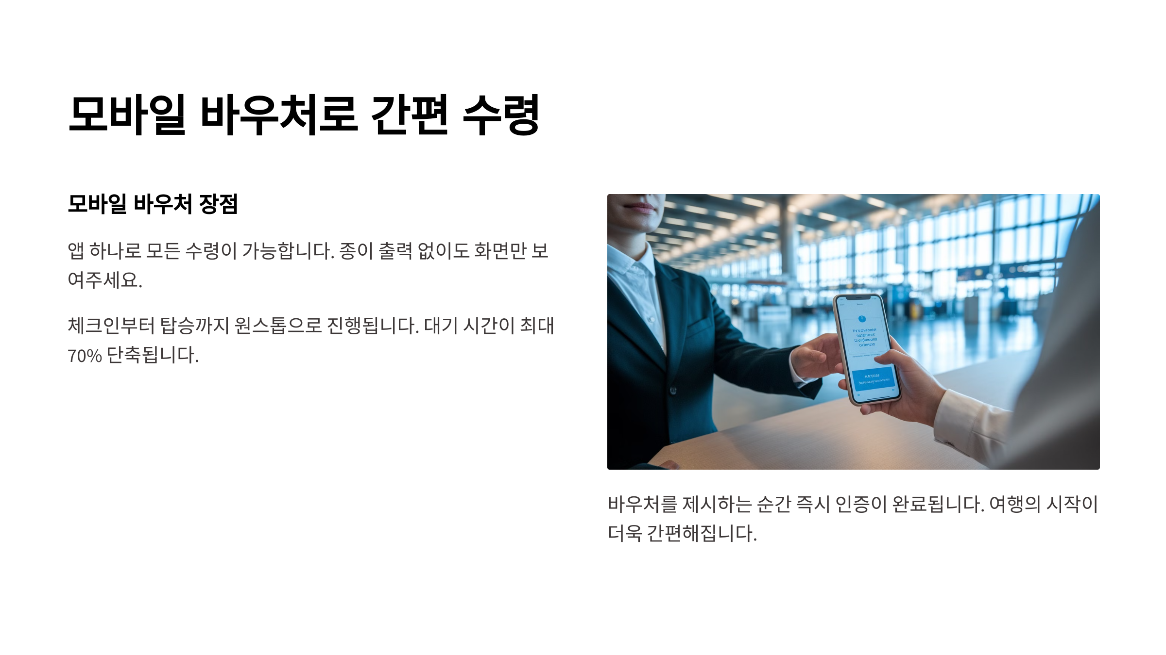 더 이상 종이 바우처를 인쇄하거나, 수령 데스크에서 줄 서서 대기할 필요가 없는 시대예요. 모바일 바우처와 앱 알림, 전자여권 셀프 인증까지 — 수령도 스마트하게 진화하고 있답니다.