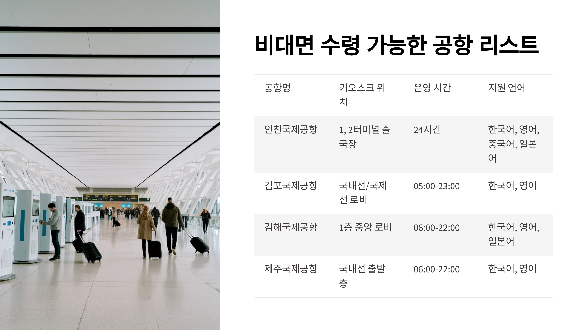 비대면 수령이 가능한 공항은 점점 늘어나고 있어요. 특히 키오스크, 스마트 수령함, 앱 기반 로봇 딜리버리 시스템까지 도입되며, '무인 수령'이 현실화되고 있답니다.