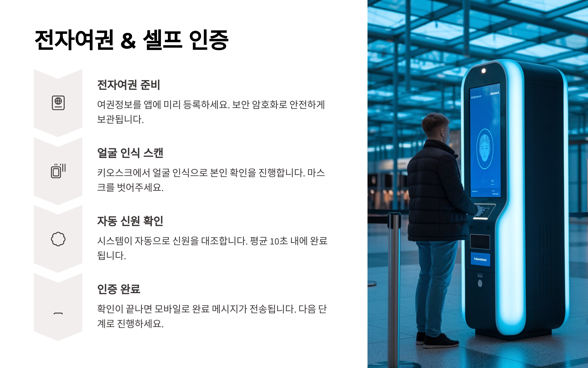 2025년 현재, 전자여권(E-passport)을 활용한 셀프 인증 서비스가 급속도로 확대되고 있어요. 특히 공항 면세품 수령이나 출입국 자동화 구역에서 많이 쓰이죠.