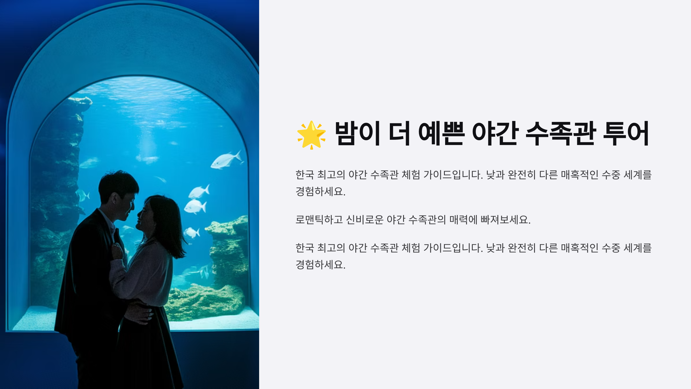 밤하늘과 바다 속 세계가 만나면 어떤 풍경이 펼쳐질까요? 요즘은 낮보다 밤이 더 아름답다는 '야간 수족관 투어'가 큰 인기를 끌고 있어요. 조용한 분위기와 은은한 조명이 어우러진 수족관은 데이트, 힐링, 가족 나들이 모두에게 최고의 장소랍니다.