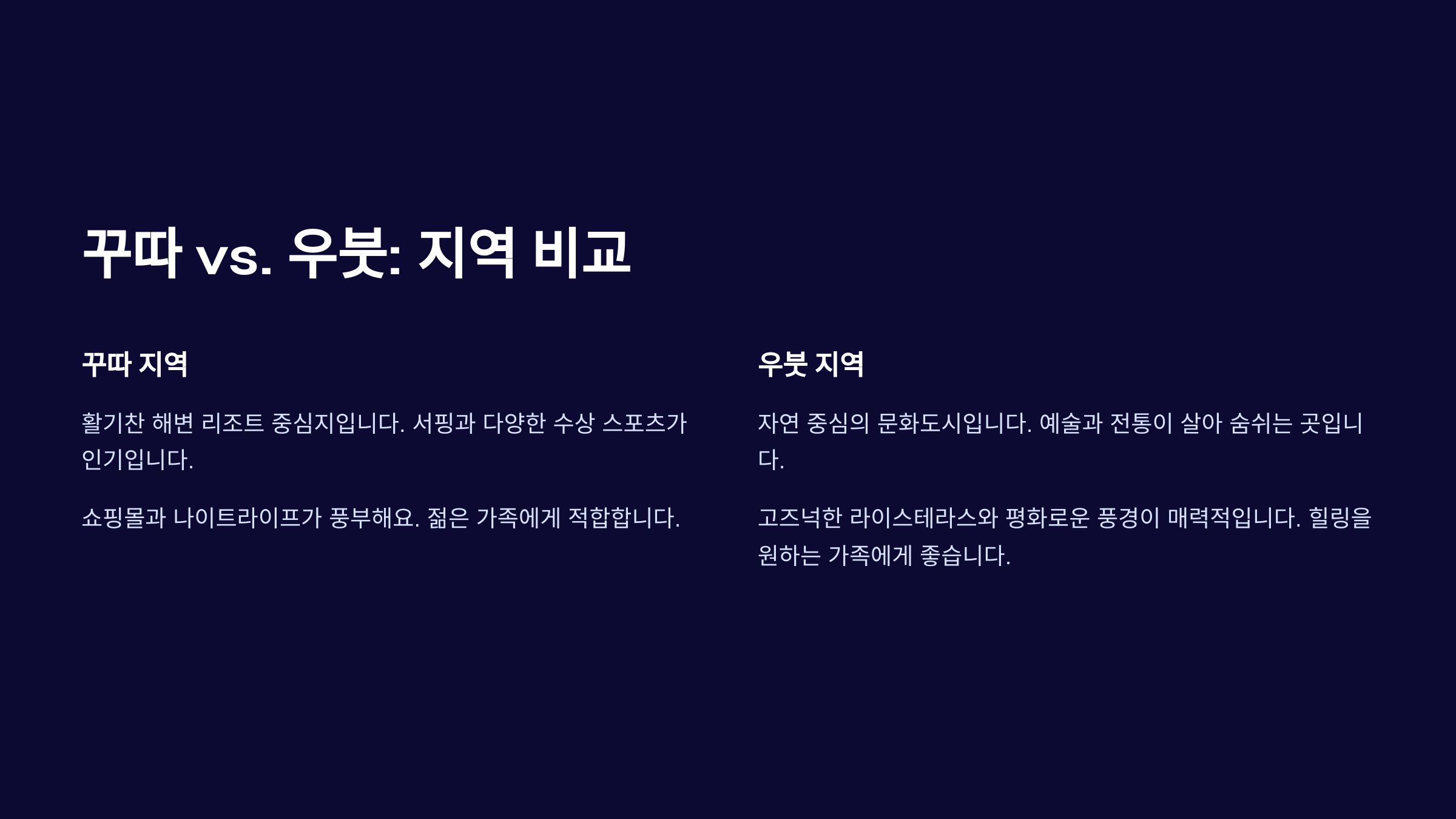 | 주요 즐길 거리 | 해양 스포츠, 쇼핑, 나이트라이프 | 요가, 예술 체험, 라이스테라스 |