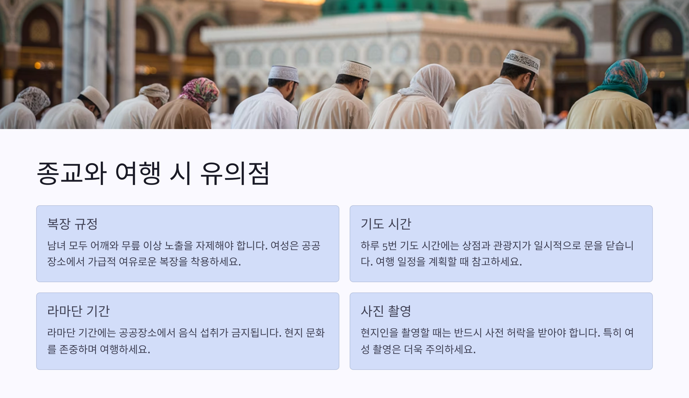 사우디아라비아는 이슬람의 발상지로, 종교적 규율이 매우 엄격하게 지켜지는 나라예요. 국민 대다수가 수니파 무슬림이고, 일상생활 전반에 종교가 깊이 뿌리내려 있어요. 여행 중에도 무슬림 문화를 존중하는 태도가 필수예요. ⛪