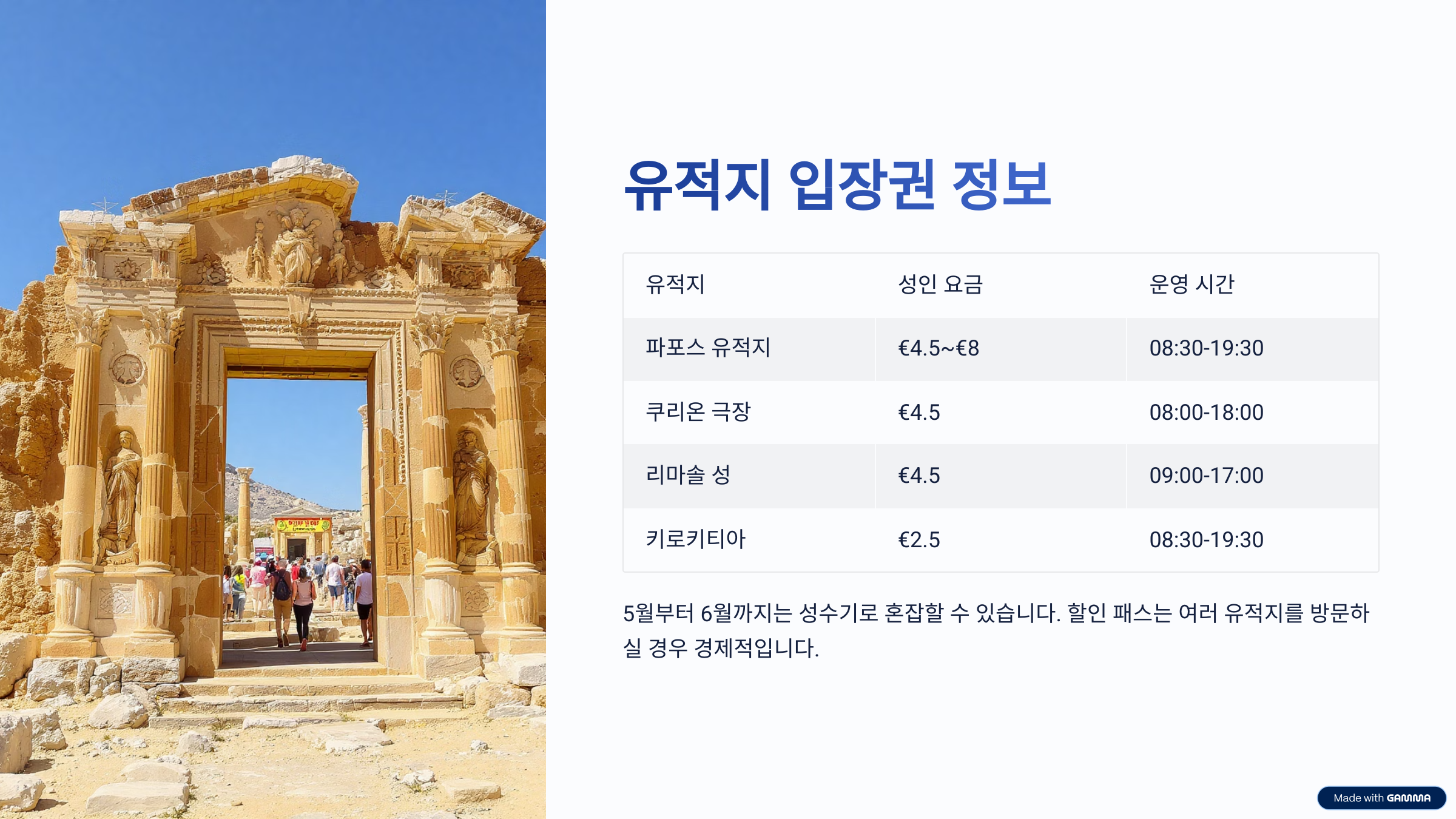 이처럼 키프로스는 시대마다 다른 문화가 덧입혀진 유적지의 교차점이에요. 여행하며 여러 시대의 흔적을 동시에 볼 수 있는 것이 큰 매력이랍니다. 🕰️