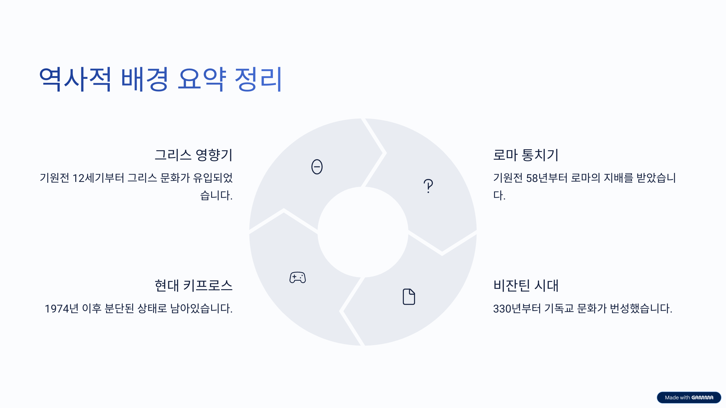키프로스는 유럽과 아시아, 아프리카의 중간 지점에 위치한 만큼 고대부터 국제적 교역과 전쟁의 중심이었어요. 최초 정착은 신석기 시대로 거슬러 올라가고, 이후 고대 그리스인들이 도시국가를 형성했어요.