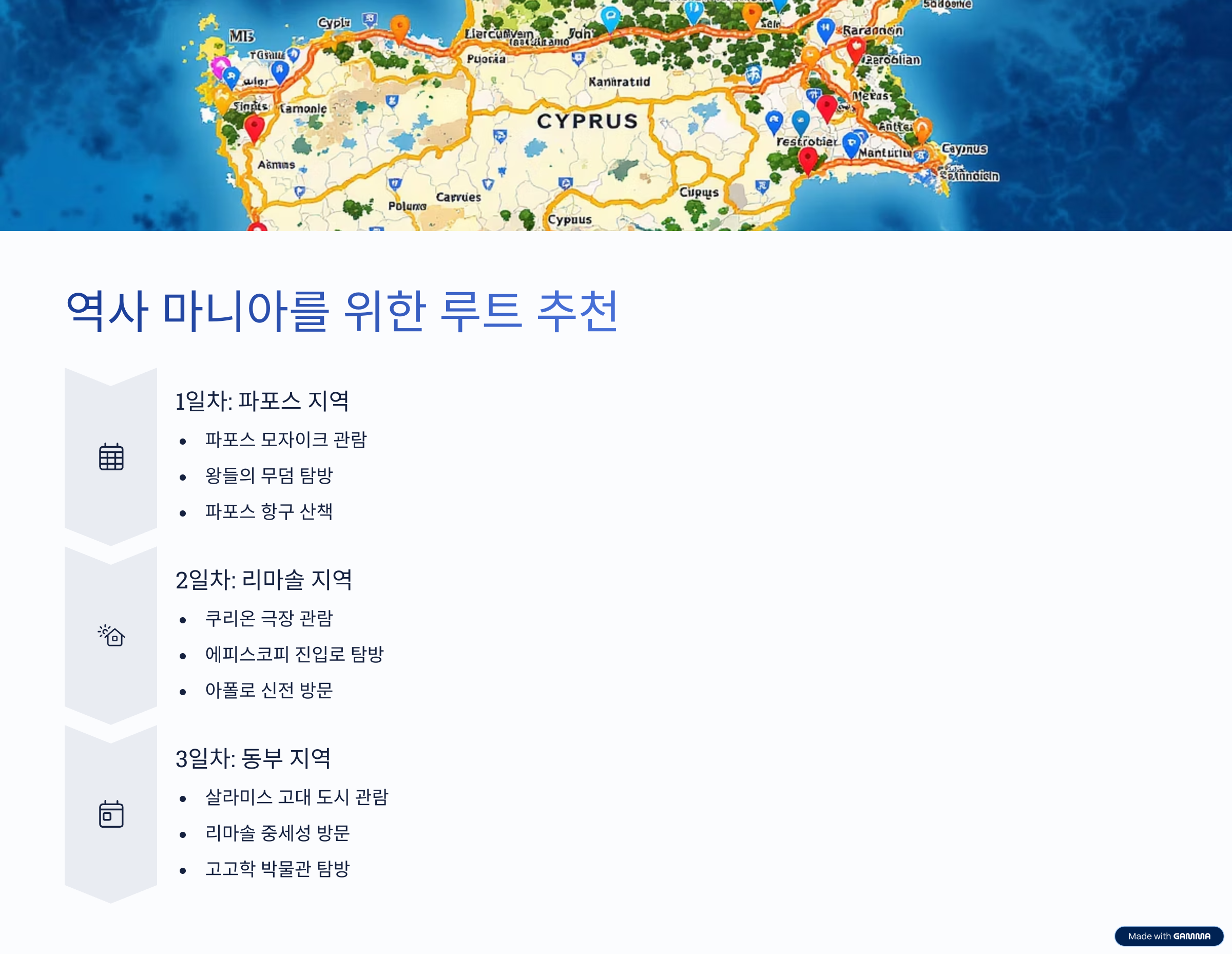 역사 마니아라면 유적지를 단순히 보는 데서 그치지 않고, 시간 순서대로 체험하는 코스를 추천해요. 아래 루트는 고대부터 근세까지 키프로스 역사를 한눈에 경험할 수 있는 여행 동선이에요.